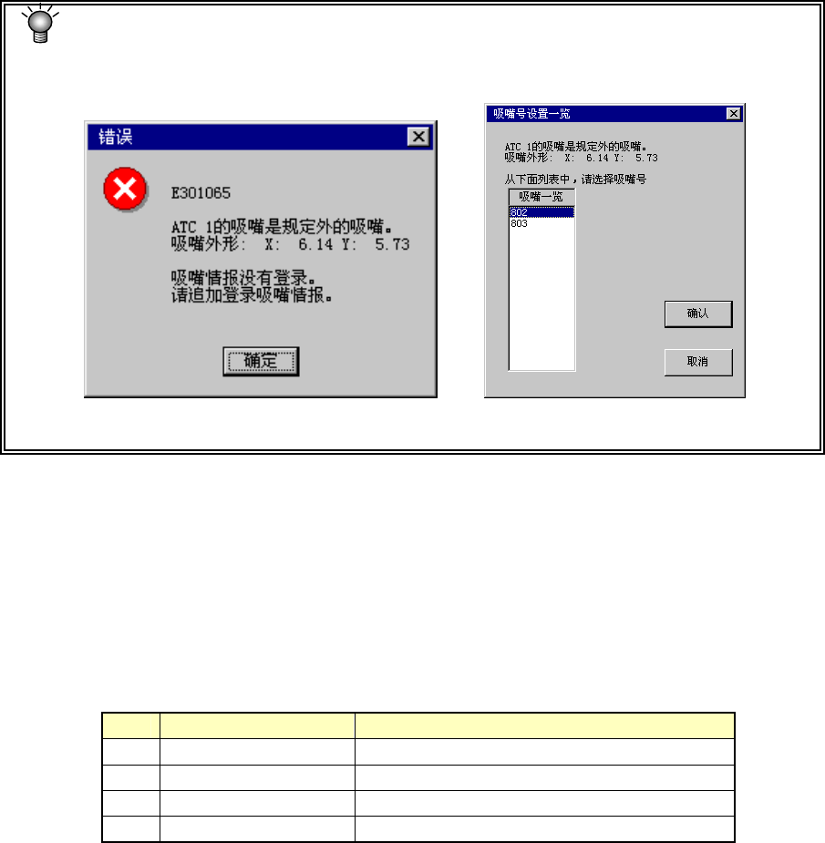 所获得的吸嘴外形不符合规定时,显示下图未登录吸嘴信息的信息框。此时,根据接下