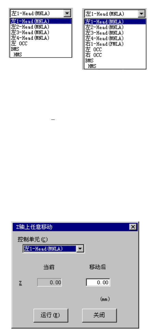 第 2 部 功能详细编 第 9 章 手动控制 9-7 通过组合框选择控制对象单元 点击▼标记或按下“Alt”+“↓”键,显示如下的一览表。 图 9-3-3 按机种显示的控制单元的说明 输入移动地点坐标,选择“执行(1 )”按钮,或按“F3”键,则所选的控制单元将移动。 任意坐标可输入的坐标范围因选择单元而异。 (9) Z 轴移动 将所选择的贴片头移动到所选的位置。 有通过所选贴片头进行的向标准位置的移动,以及向任意坐标的移动。 标准位置…
