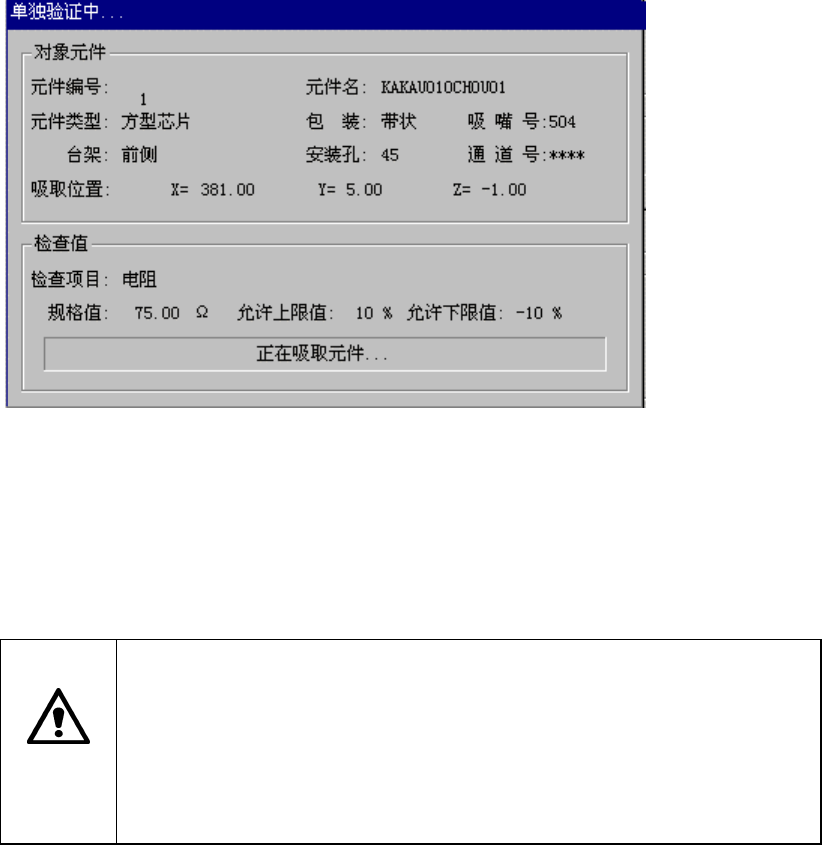 第 1 部 基本编 第 2 章 生产 2-82 ③ 验证结果 显示当前选中元件的检查项目、规格值、上限、下限。 元件检查后,在实测值中显示检查结果。 按下“单独检查”按钮执行单独检查,显示如下的画面。 图 2.10.6.1.4 正在进行单独检查 ・ · 对象元件(检查中的元件) 显示检查中的元件内容。 · 检查值(检查中的值) 显示检查项目、规格值、允许值的上限下限与当前的动作状态。 注意 按下“单独检查” ,贴片头立即移动,开始生产。…