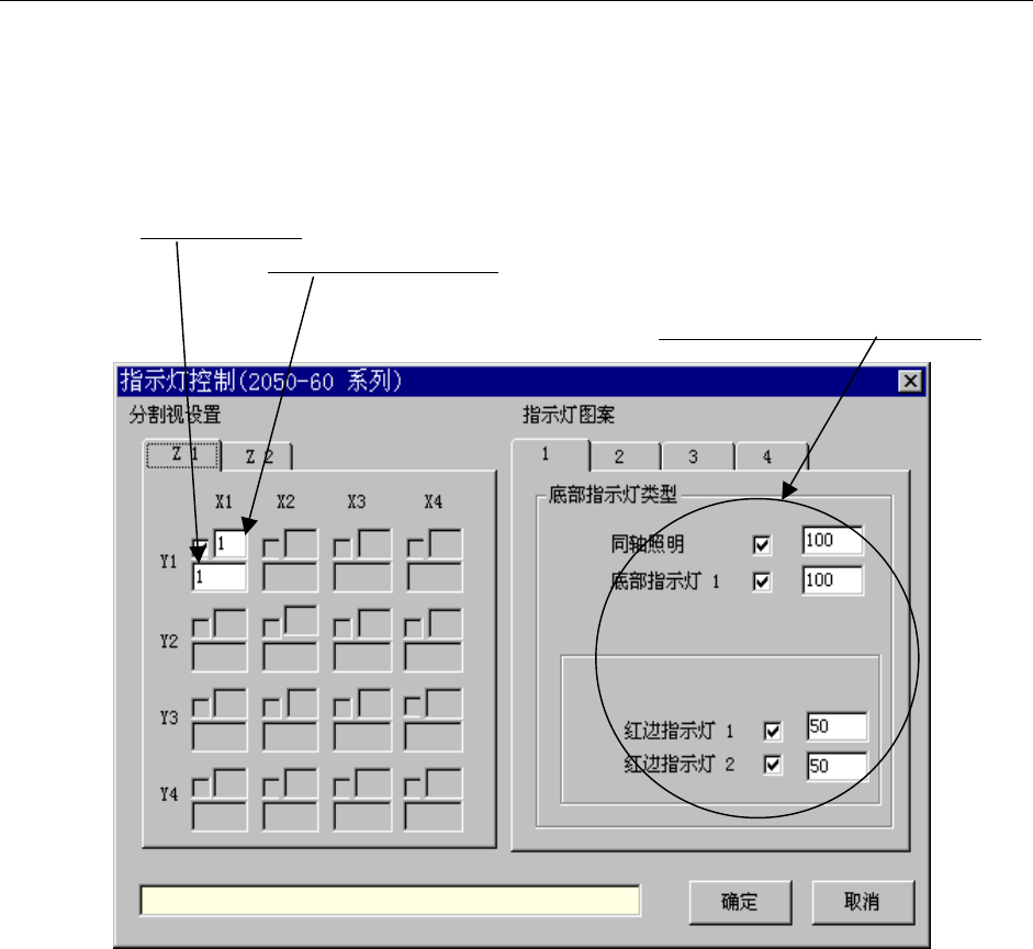 第1部 基本篇 第4章 生产程序制作 4-102 4-3-7-6 指示灯控制(照明控制数据) 可指定用VCS识别时的照明控制(下图为不进行分割识别时的例子)。 ① 分割视野设置 在进行分割识别时,显示其等分数(目前最大为 4 次)。 “Z2”现在没有使用。 照射图案的编号 (照射图案有多个时,指定其编号)。 分割识别时的识别顺序 。 画面显示因照明的种类而不同。 图 4.3.7.6.1 照明控制数据 ② 指示灯图案 可设置各 LED 的…