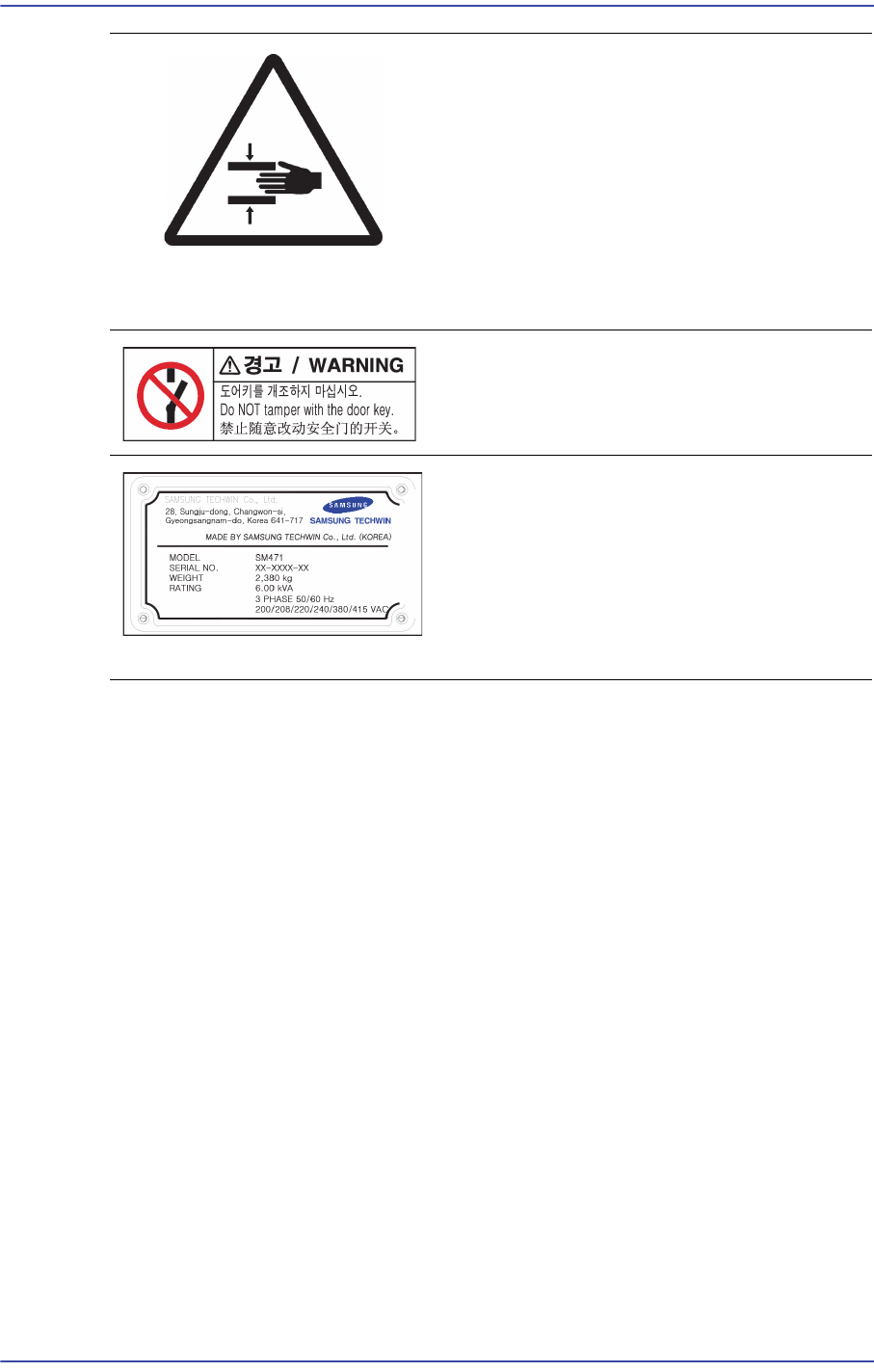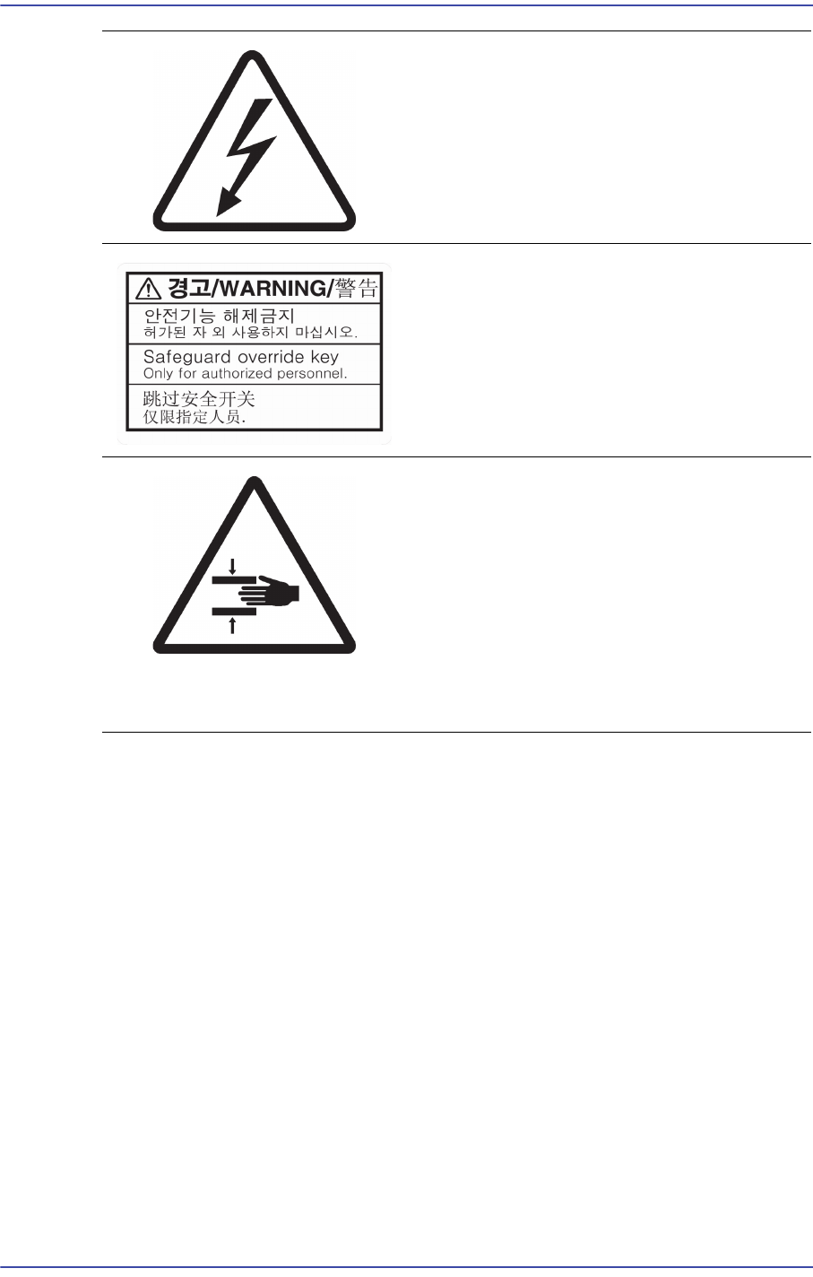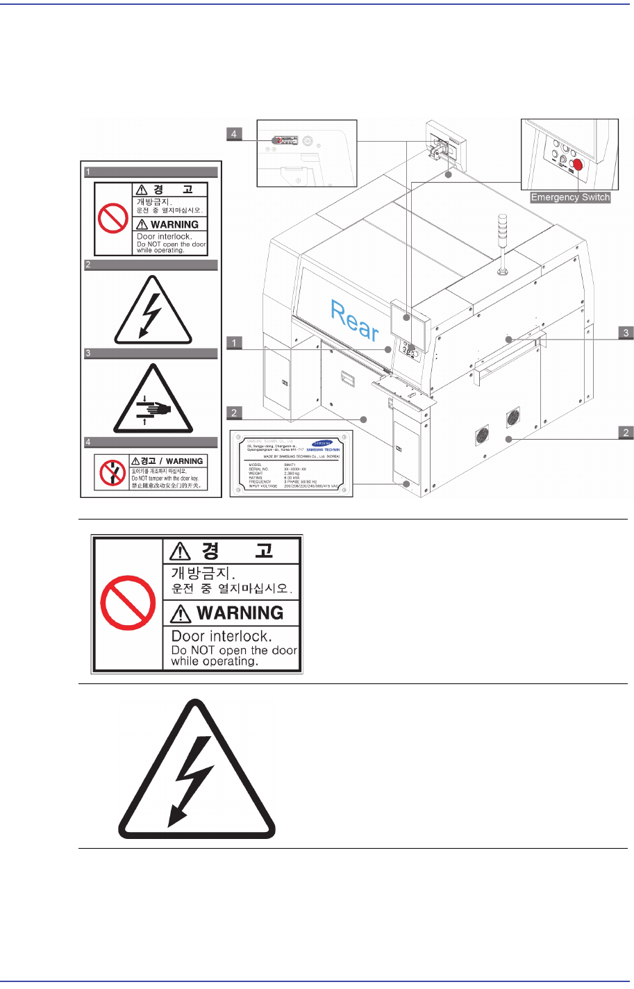 머리말 v 장비 후면 장비의 후면에 는 다음과 같은 라벨들이 부착되어 있습니 다 . 그림 1.2 장비 후면에 부착된 안전 라벨 운전 중 도어를 열지 말 것 . 이 라벨이 부착되 어 있는 곳은 이동체가 내 장되어 있으므로 구동 중 커버를 열고 신체 의 일부를 장비 내부로 집어넣을 경우에 대 단히 위험합니다 . 커버 내측이나 스위치 부위에 고전압이 흐르 고 있으니 감전에 주의하시기 바랍니다 …