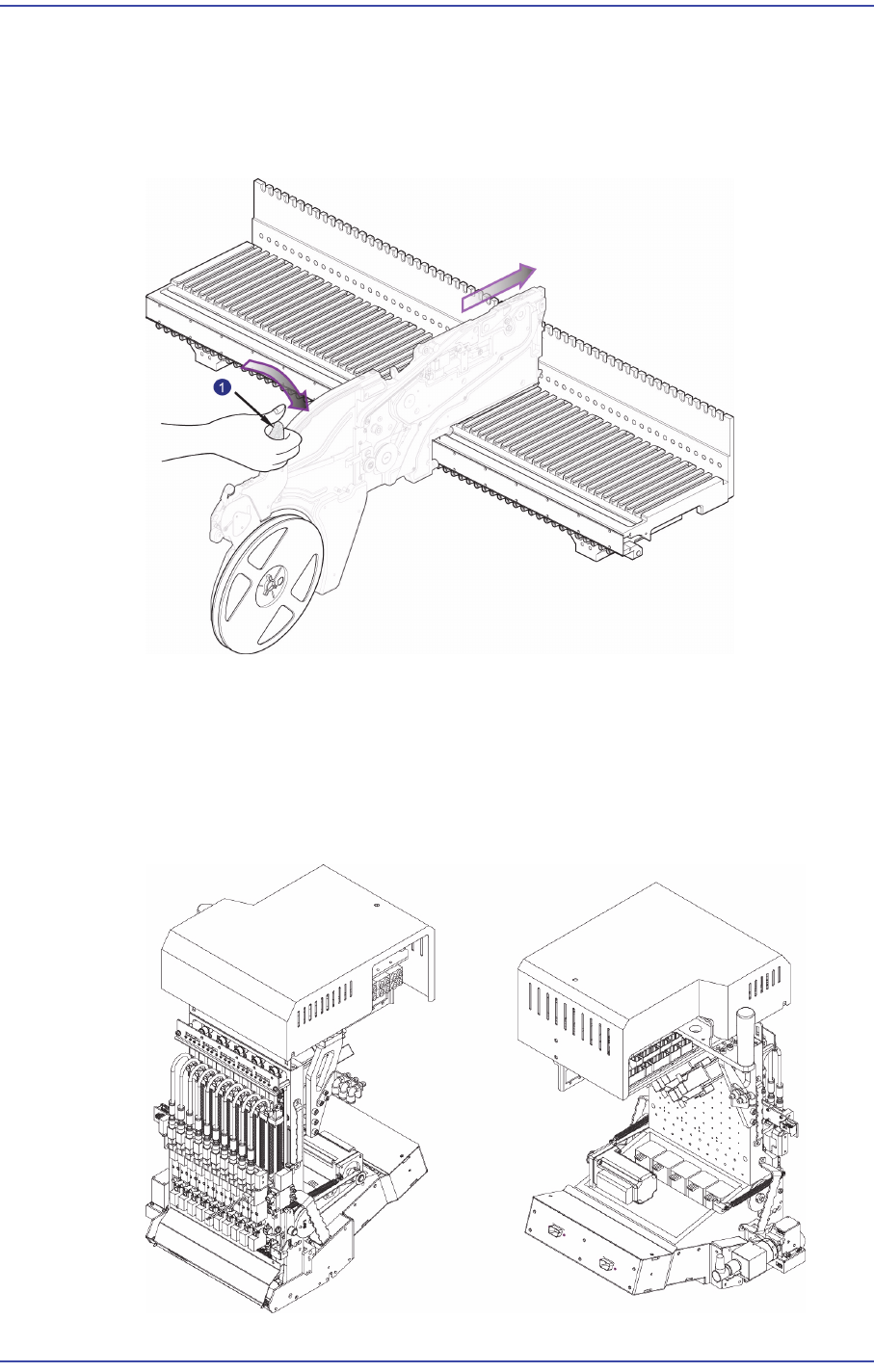 머리말 xv T ape Feeder 릴 형태 의 부품케이스에 Roll 방식으로 감겨진 부품을 공급하 는 기계장치로 피 더베이스에 장착 (Installation) 됩니다 . 다음 그림과 같이 반드시 피더베이스에 SM 피더를 장착 후 , 잠금 손잡이 를 잠궈야 합니다 . 1: 잠금 손잡이 Head Assembly 헤드 어셈 블리에 속해 있는 기구물들 또는 공압장치들 을 지지하는 Head …