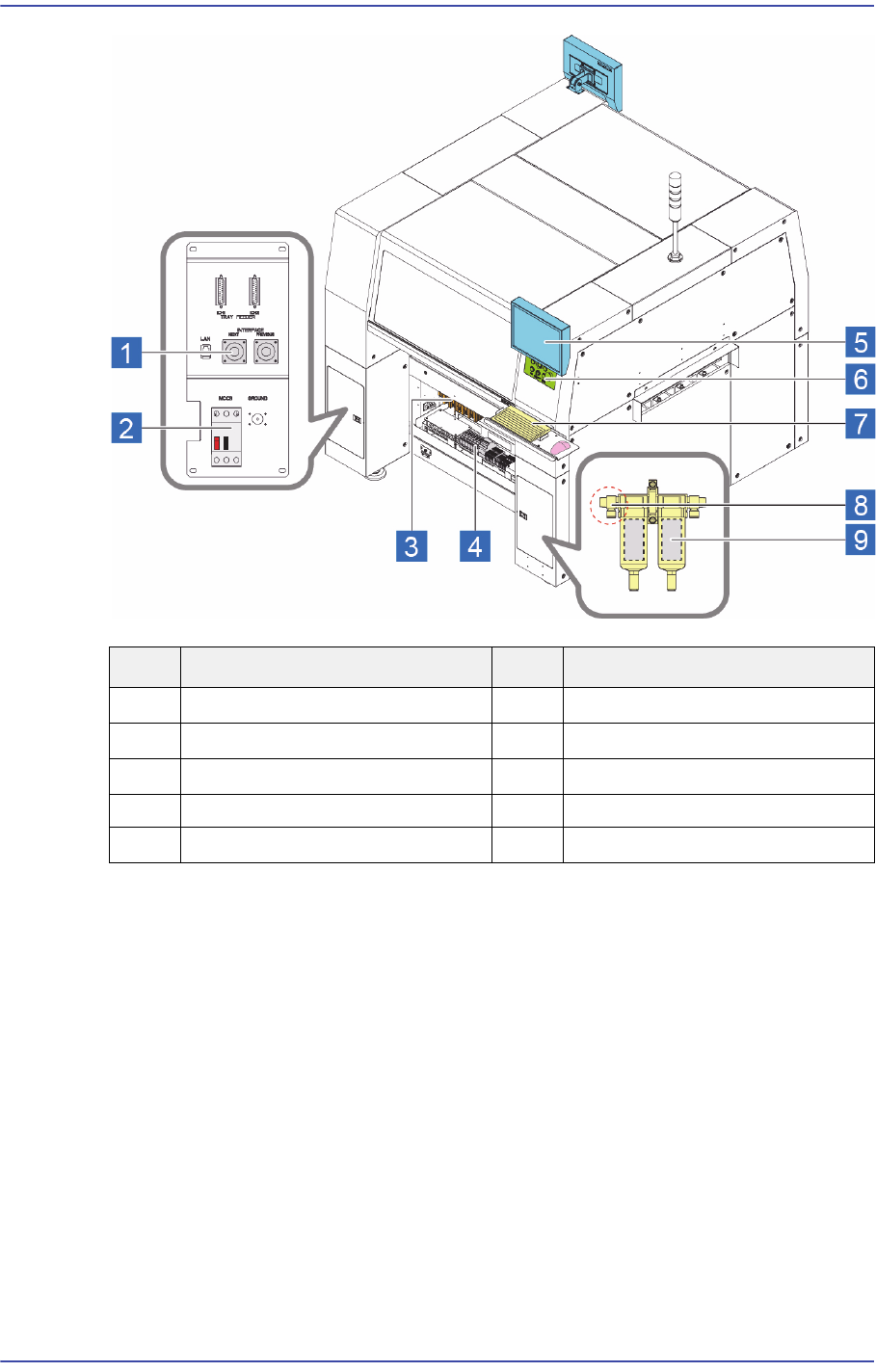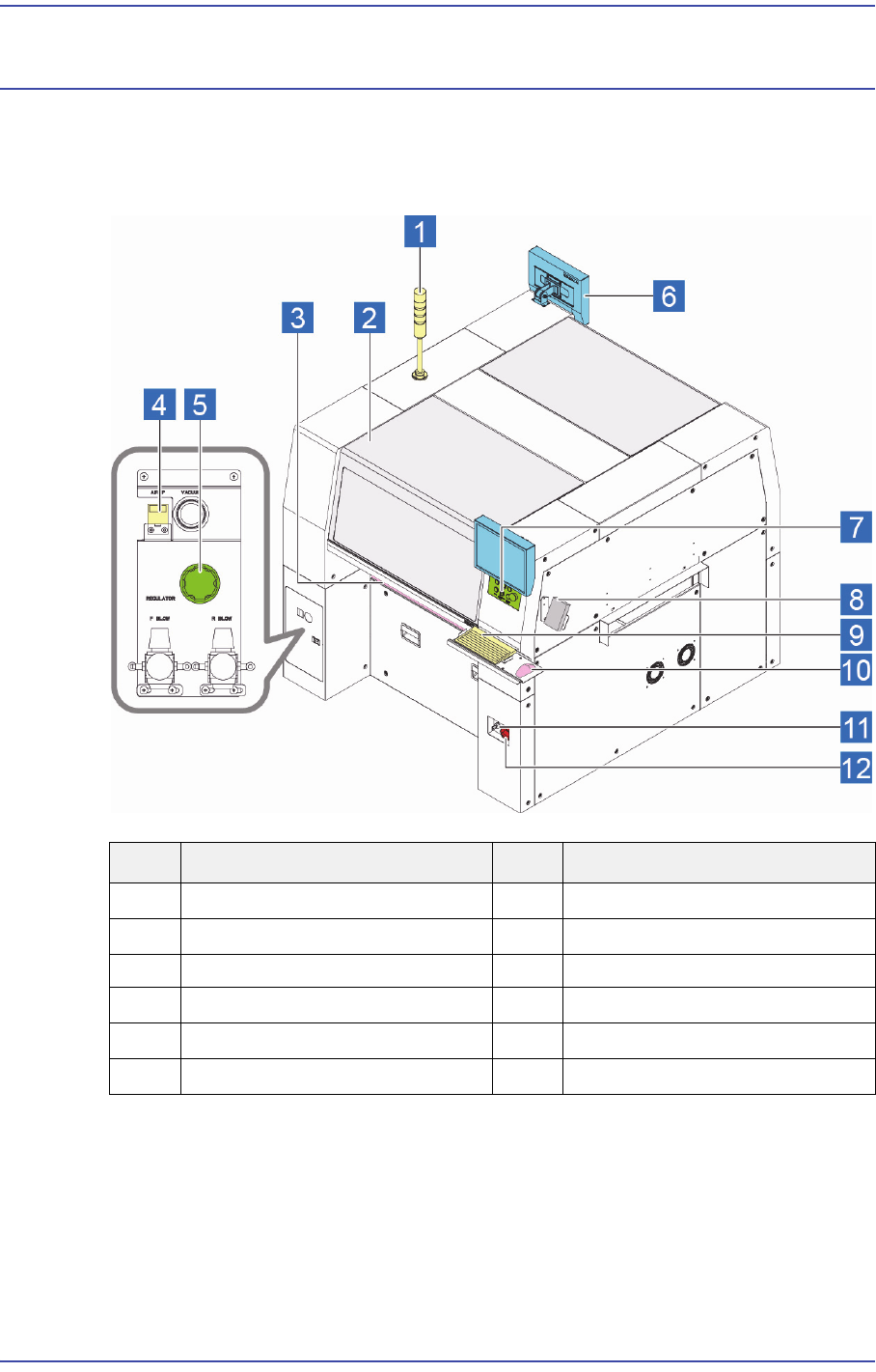 3-1 장비의 명칭 및 구성 제 3 장 . 장비의 명칭 및 구성 3.1. 장비의 외관 및 명칭 그림 3.1 장비의 외관 No. Name No. Name 1 시그널 라이트 7 전면 조 작패널 2 안전커버 (Door) 8 티칭박스 3 피더스테이션 9 키보드 4 압력 게이 지 10 마우스 5 압력조절기 (Regulator) 11 Safeguard Overrides 키 스위 치 6 전면 LCD 모니…
