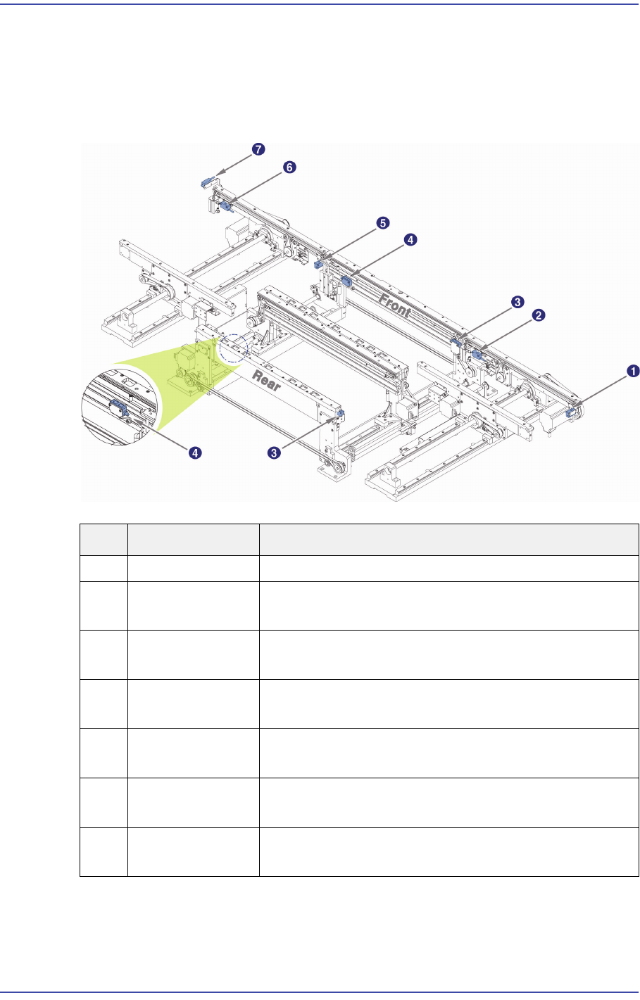 5-3 센서의 기능 5.3. 기판 검출 센서 컨베이어의 PCB 반입 / 반출 경로 상에는 5 개의 기판 검출 센서가 설치되어 있습니 다 . 그림 5.2 기판 검출 센서 위치 No. 명칭 기 능 1 Entry Sensor1 이전 공정 에서 본 장비로의 PCB 반입을 감지합니다 . 2 Entry Sensor2 Entry S tation 으로 PCB 가 정 상적으로 반입이 완료됨을 감지합니다 . …