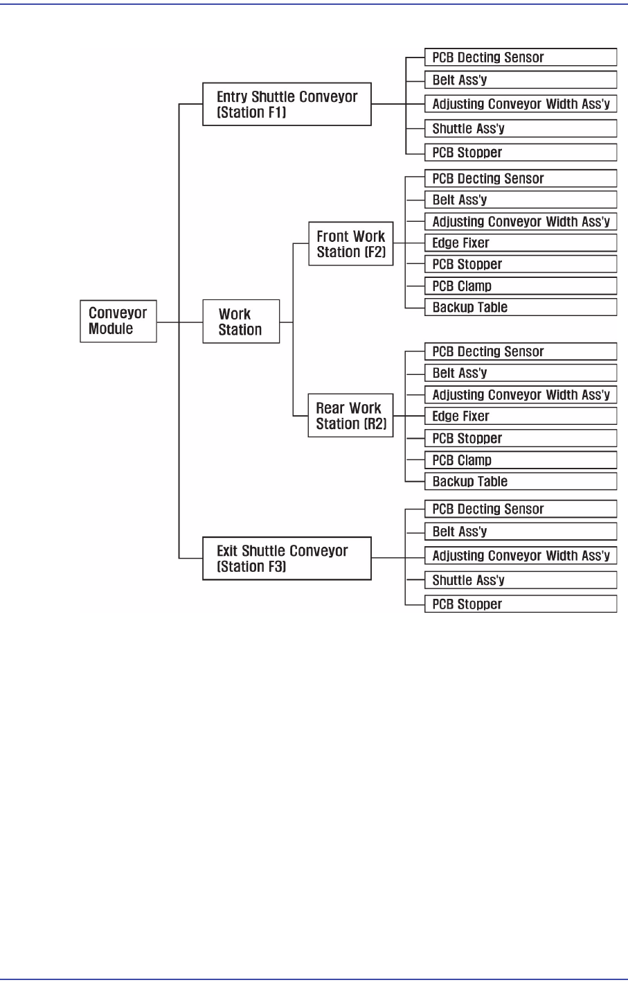 6-3 Module Function 그림 6.3 PCB Conveyor System 구성도 6.3.2. 기능 각 구성 요소별 기능은 다음과 같습니다 . Co nveyor Module Entry Shuttle Conveyor Frame, W ork Conv eyor F rame, Exit Shu ttle Conveyor Frame PCB 흐름의 기본 이 되며 Unit 별로 각종 Part 가…