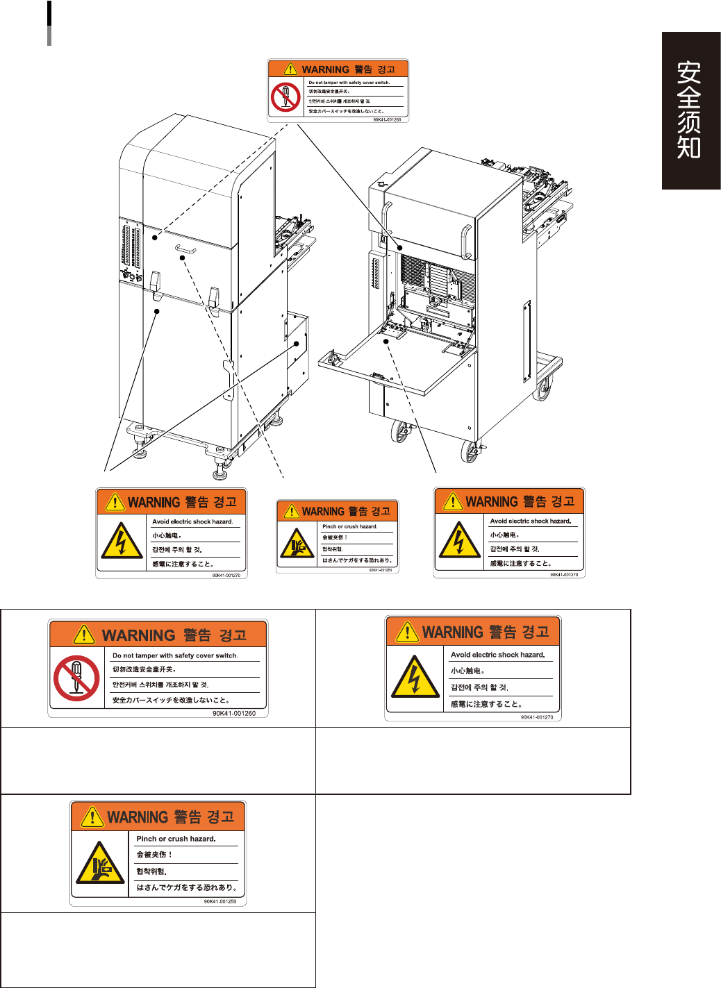 xi ■ 标贴张贴位置 sA TS30 cA TS10 警告标贴 sATS30、cATS10 ■ 柜门开口部 ■ 底座盖板部 ■ 柜门开口部 ■ 柜门开口部 95204-KMK-00 设备的可动部碰触身体,会有受伤的危险。 当心触电。 请勿随意触摸、改造机盖开关。请勿在解除机盖开关的状态下运行 设备。 请勿用手触摸盖板内的电源部。 ‧ 手有被可动部与盖板夹伤的危险。 ‧ 手或手指有被可动部夹伤的危险。 设备运行过程中或操作载料箱时,请勿…