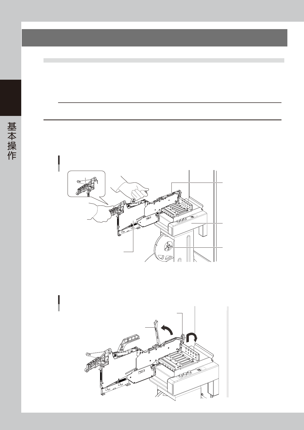 2-38 2 4. 带装元件的准备 4.1 带式送料器 4.1.1 带装元件的安装 下面,以 ZS 电动送料器为例介绍将带装元件装入送料器的方法。 关于 SS 电动送料器的详细使用方法,请参照《SS FEEDER 用户操作手册》 。 c 注意 安装带装元件时,请务必使用上料台或离线上料台安装。直接在贴片机上安装,可能会使料带上的元件掉落到贴片机内部。因此, 请勿直接在贴片机上安装带装元件。 1 安装送料器与料带盘。 1. 握住送料…
