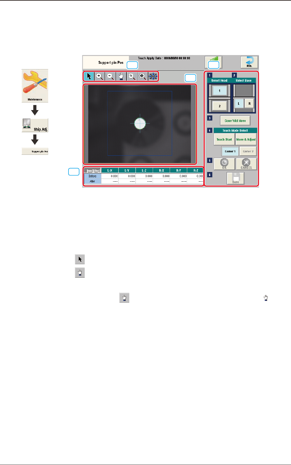 3OM-1751 1-67 1303-001 5.16 "Support pin Pos" Window This window enables the operator to perform the teaching operation on the PCB support pin position. [2] [1] [3] [4] F3A47 [1] Display Area Operation Button U…