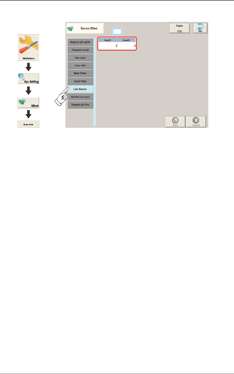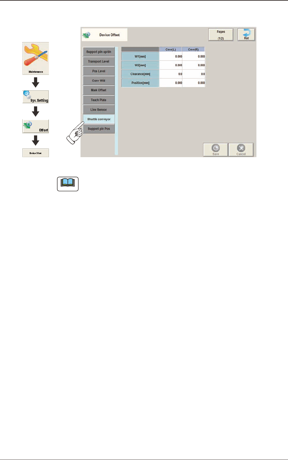 3OM-1751 2-13 1303-001 2.1.8 "Shuttle conveyor" T ab Sheet F3B13 Note This setting is used as an option. Graphic Development 2.1 "Device Offset" Window