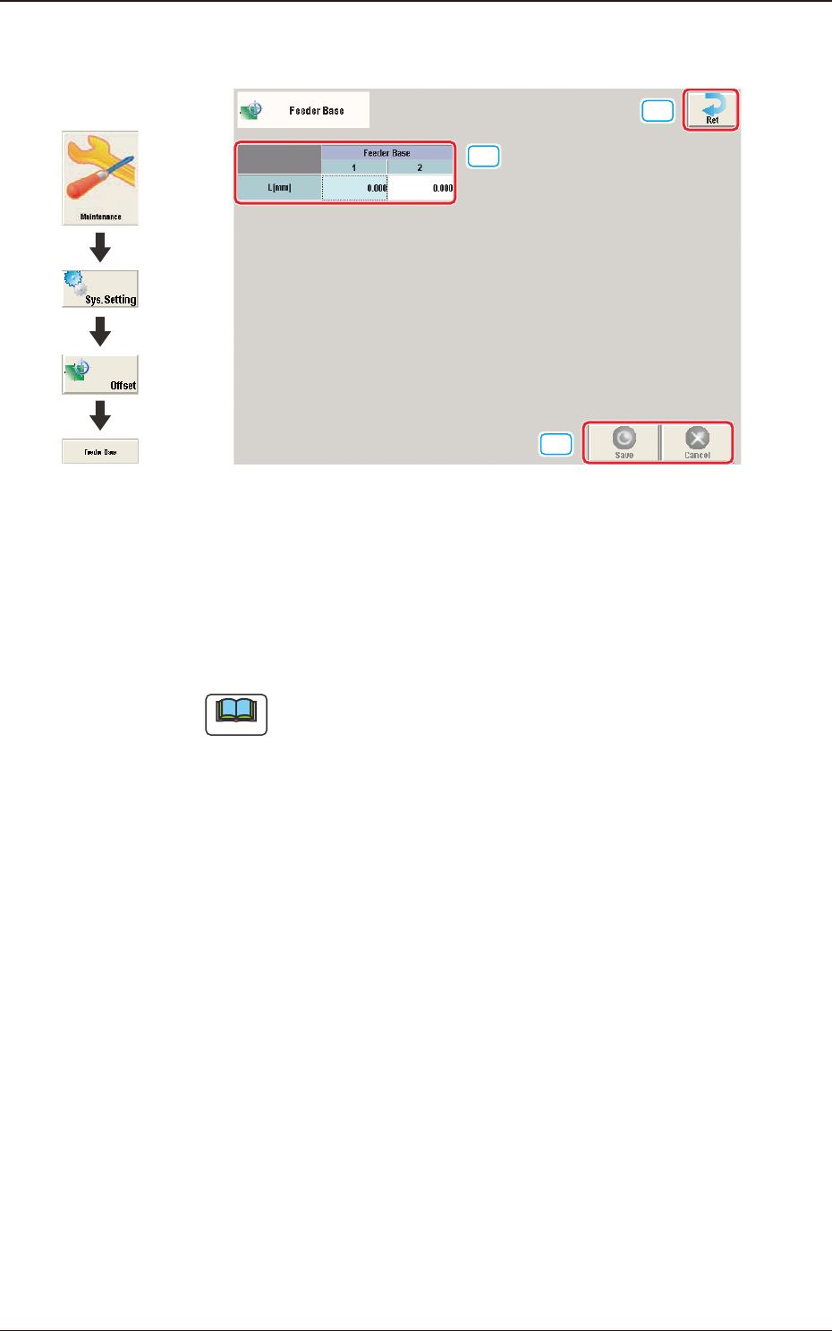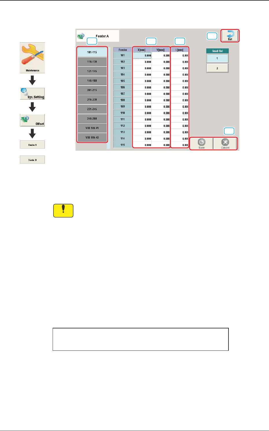 3OM-1751 2-23 1303-001 2.3 "Feeder A" and "Feeder B" Window [1] [2] [3] [4] [5] F3B23 Feeder Offset A This offset data is used to correct variation in each feeder slot (Fdr No.) of the feeder base. No…