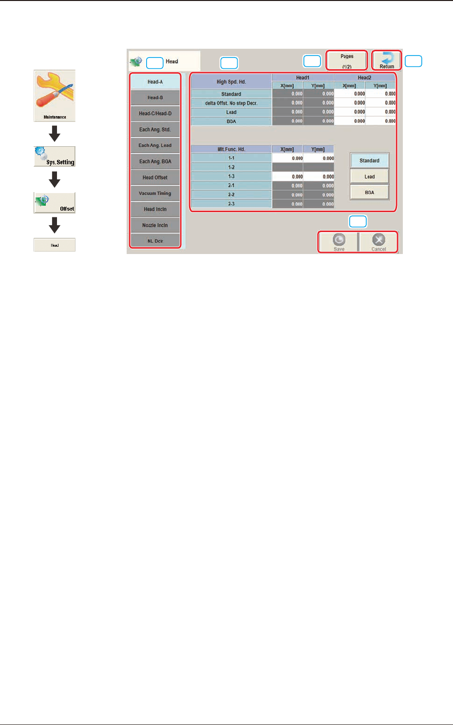 3OM-1751 2-31 1303-001 2.5.1 "Head-A" T ab Sheet [1] [2] [3] F3B31 [1] High Spd. Hd., Head 1 and Head 2 X [mm], Y [mm] Standard The set parameters are used to adjust the deviations of the head rotational center…
