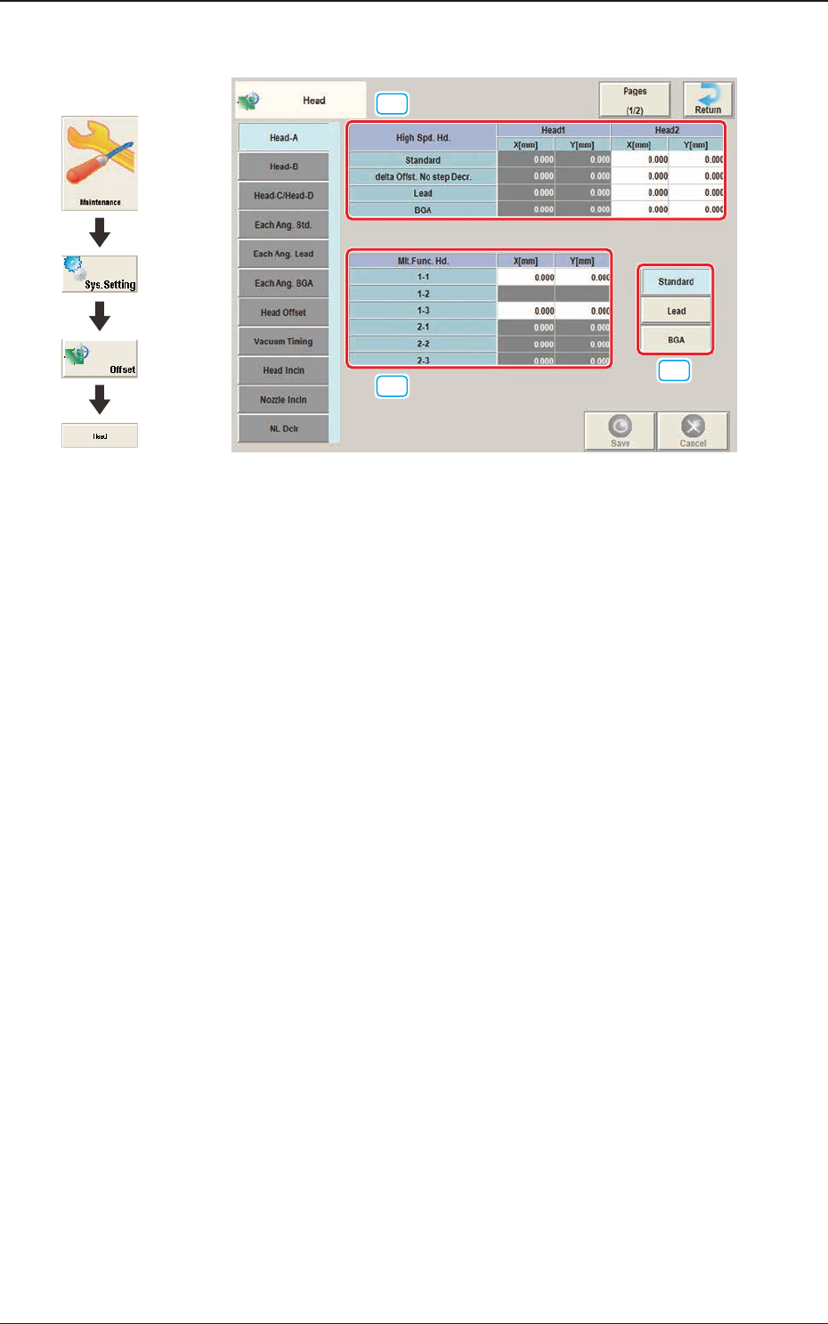 3OM-1751 2-32 1303-001 [2] Mlt.Func. Hd. X [mm], Y [mm] The set parameters are used to adjust the deviations of the head rotational centers caused due to the movement of the head U/D axes. [3] [Standard] Button When the …
