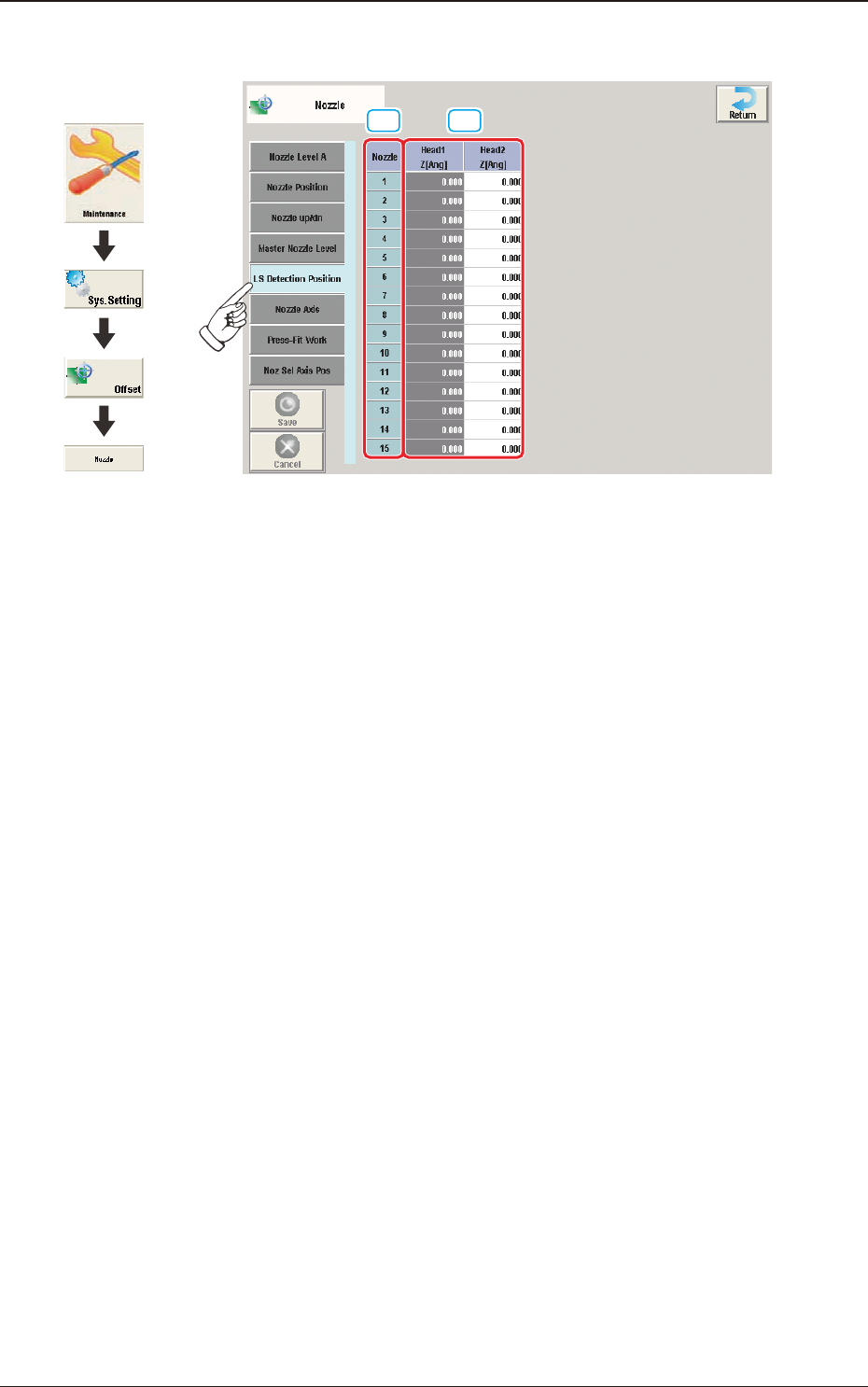 3OM-1751 2-52 1303-001 2.6.4 "Master Nozzle Level" T ab Sheet [1] F3B51 [1] Head 1 and Head 2 L [mm] Each parameter indicates the reference position (the values read by the linear measure) of the master nozzle …