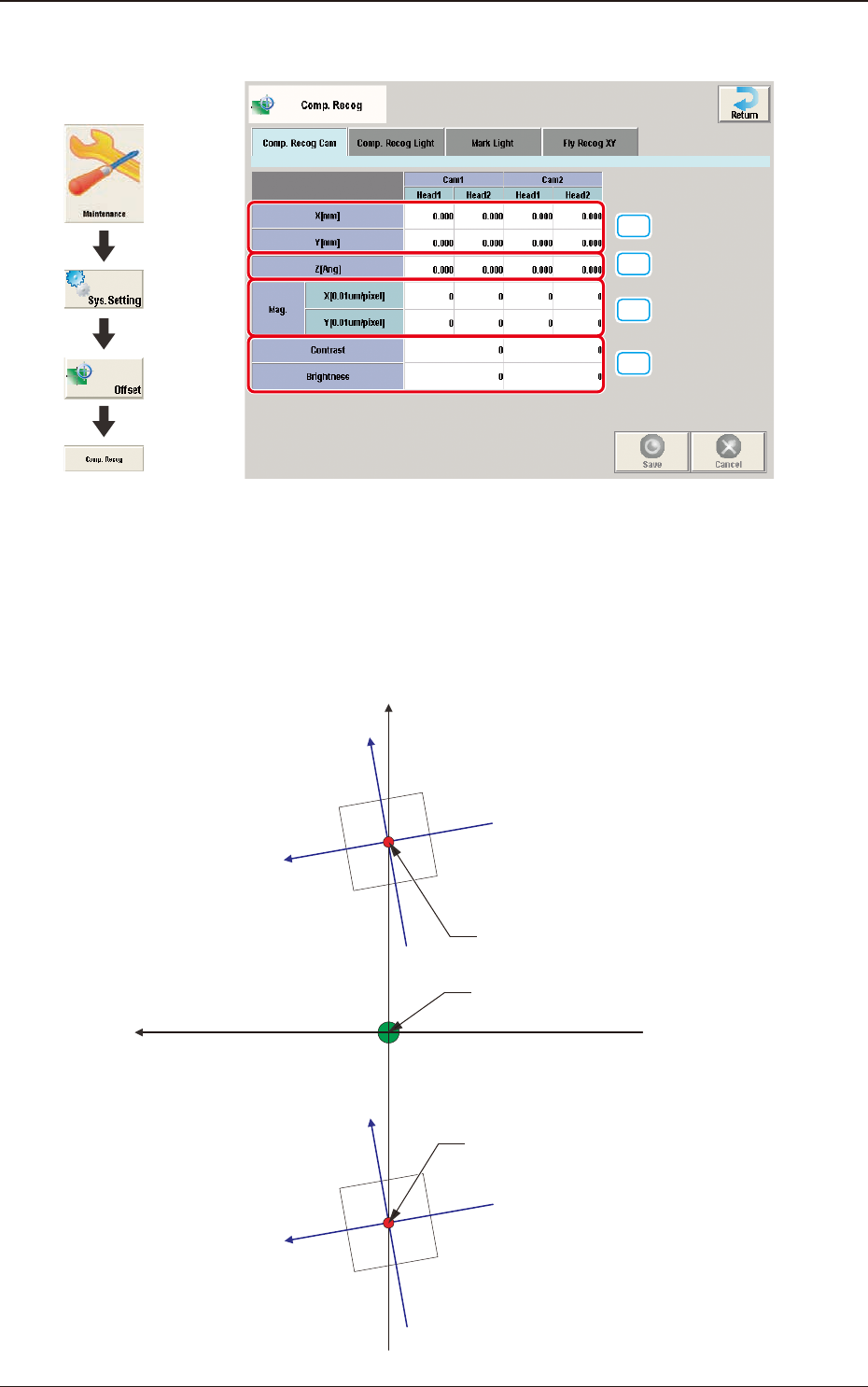 3OM-1751 2-64 1303-001 [2] Z (Angle) [Ang] Set the parameters representing the angular deviations in the scanning coordinates of the component recognition cameras based on the machine reference X/Y coordinates (Xm-Ym). W…