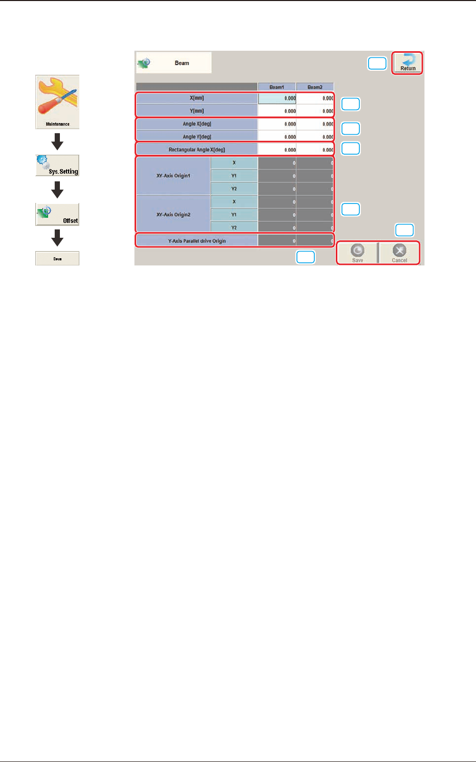 3OM-1751 2-27 1303-001 [2] Angle X and Angle Y [deg] The set parameters are used to adjust the beam X and Y axes to the machine reference coordinate system. Xm(+) Ym(+) Yb(+) Xb(+) Yb(+) Xb(+) Head Origin Pm. Machine Ref…
