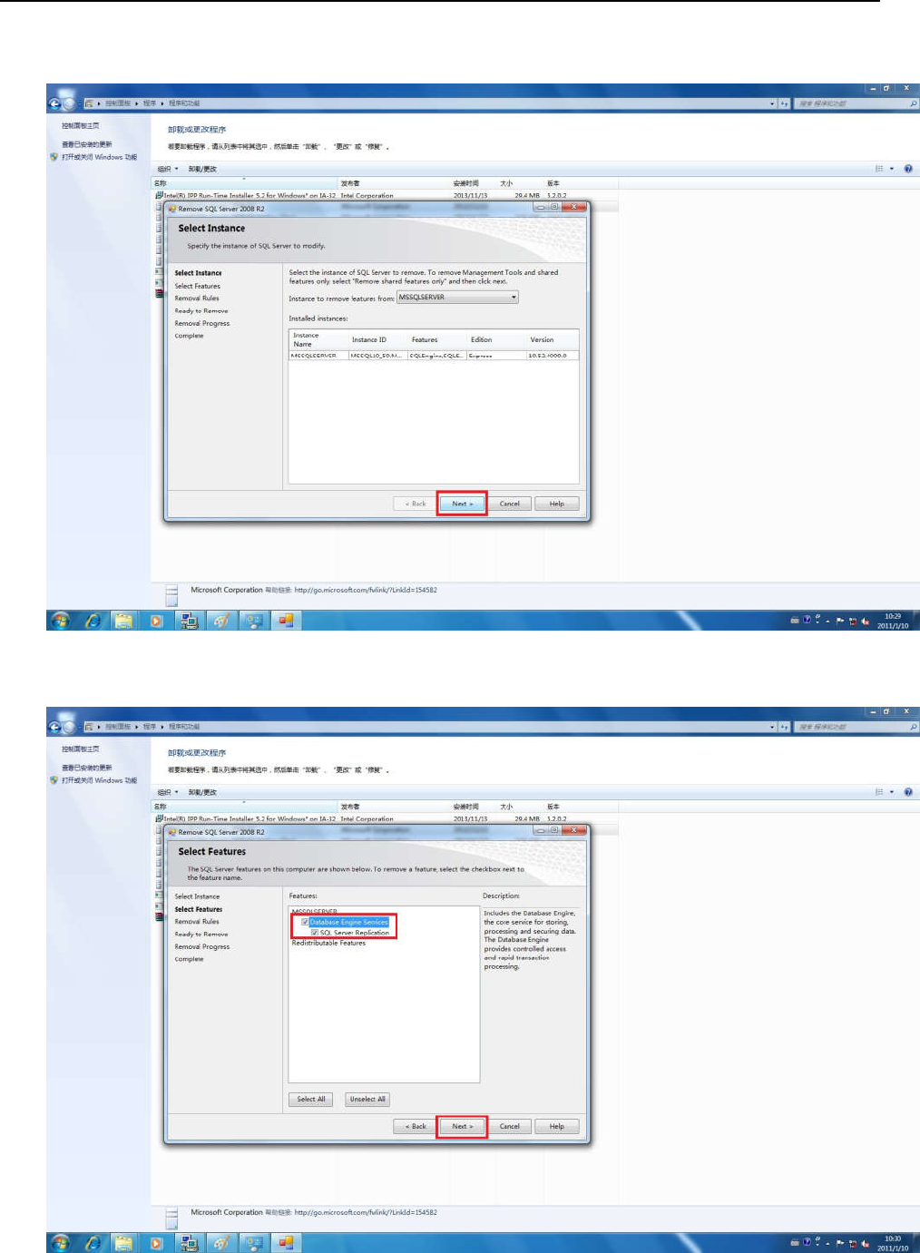 选择 SQL2008 各组件程序,如下图所示.点 remove 开始卸载,从第一