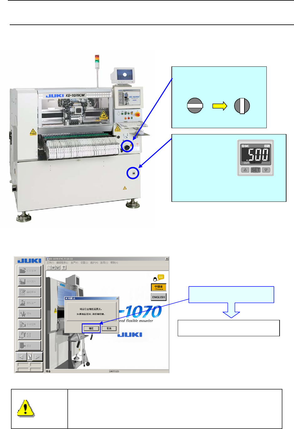 2-2 操作概要 步骤 1 接通主机电源 背面 ① 请确认装置内部没有基板和工具等。 ② 向右旋转主开关,确认气压表(压力表) 。 ③ Windows XP 和主机软件依次起动后,显示下列画面信息。 选择「OK」 ,则开始返回原点。 请选择「确定 」 。 全轴起动,开始返回原 点。 请把主开关向右扭转 90 ° <切断电源> <接通电源> 请检查压力表 <压力正常> 0.5MPa±0.05 ※ 低于 0.4MPa 时, 请检查压力系统。…