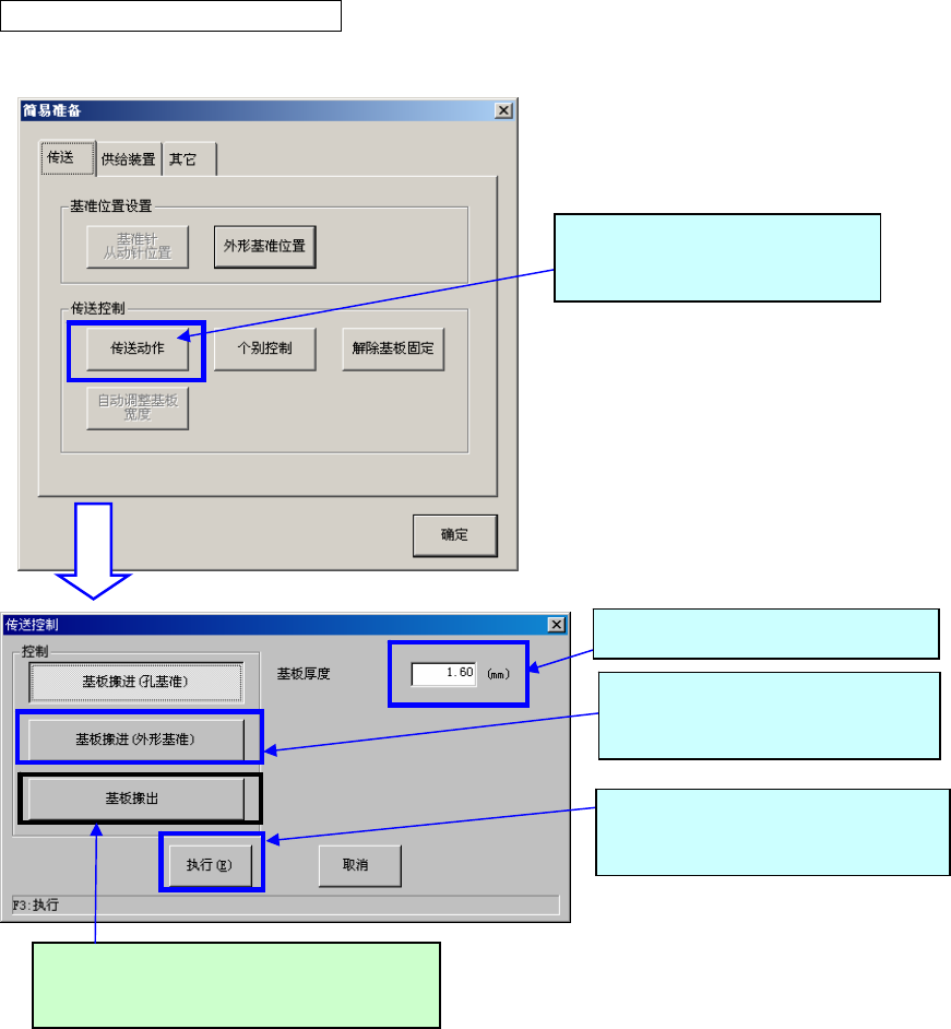 〈顺序 5〉检查基板的传送状况。 请在 IN 缓冲(传送带站台)上设置基板,确认在连续动作时基板移动流畅无阻。 显示传送控制画面。 选择「传送动作」 。 请在简易准备画面上 2 . 请选择「基板搬进(外形基 准) 」 。 3. 请按下「执行」 。 使基板搬入·固定。 1. 请输入基板厚度。 选择「基板搬出」 ,按下「执行」后, 即可搬出基板 。 10 2-