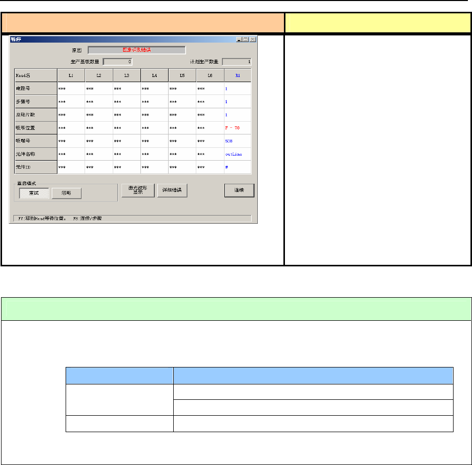 3-5 发生错误 (LA识别错误、芯片站立、异元件判定) 错误画面 错误要因、原因 生产程序的值与激光计 算的值不一致 时显示错误。 ①芯片站立错误。 ②异元件错误。 ③LA(激光)重试超次。 ④吸取偏移。 根据错误情况, 显示 相应的提示。 处理错误的方法 ☆ 芯片站立错误(仅限于在元件数据「检查」中设置过「芯片站立」的元件) 发生错误的时间 确认和处理 确认检查元件有无挂错位 补充元件后立即 检查元件吸取位置有无问题,重新示教 重新…