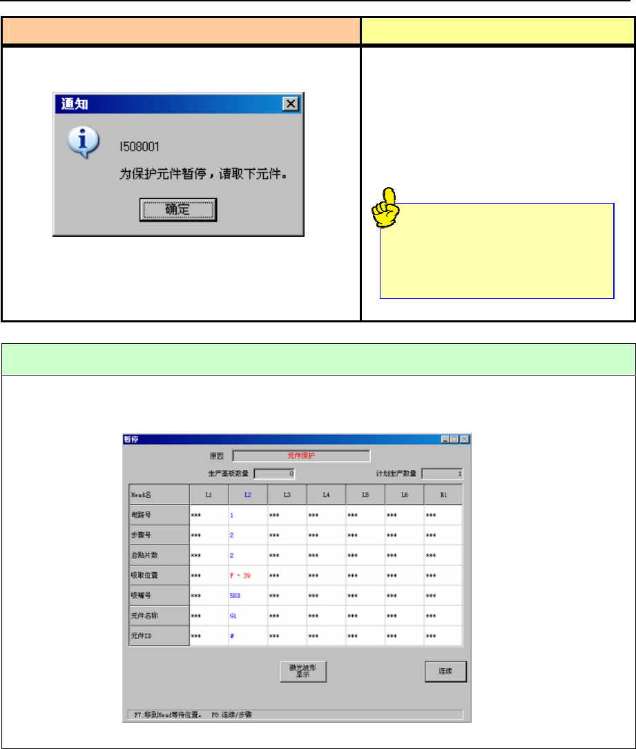 按下「确定」按钮后,显示如下「暂停 元件保护」画面。请按下开始开关重启生产。