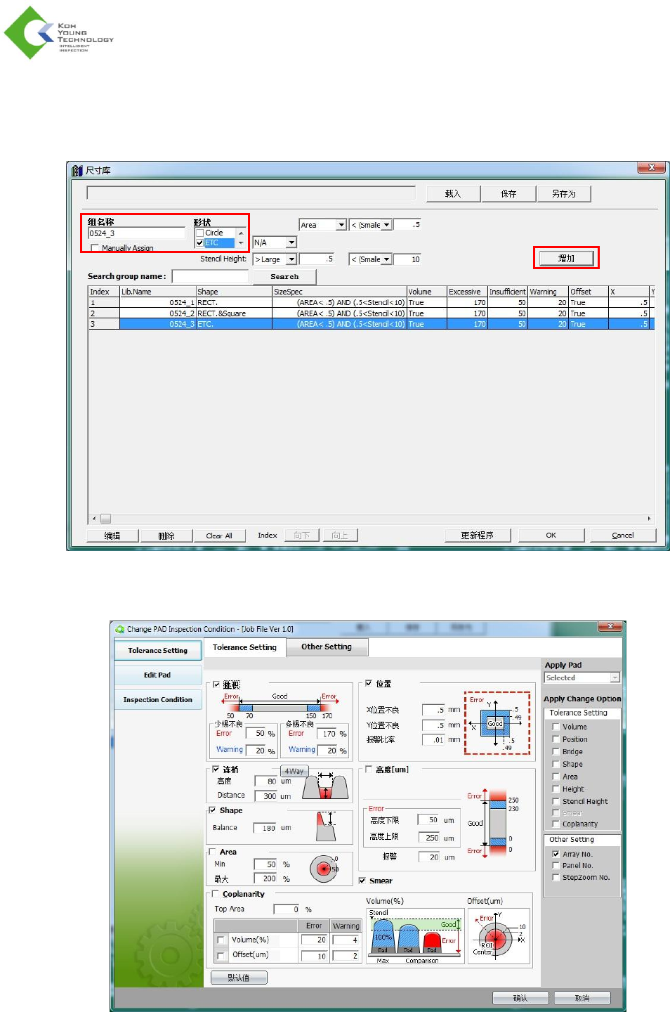 21 K oh Y oung Technolog y Inc. Measure to Optimi ze: A Comp lete 3D Inspection So luti on 6. 输入所 有条件后 ,载入 Jo b 文件并单 击 “U pd at e JOB ” ( 更新程 序) 按钮。或 创建新的 Job 文件。 然 后,当前条件应用于 Job 文件。