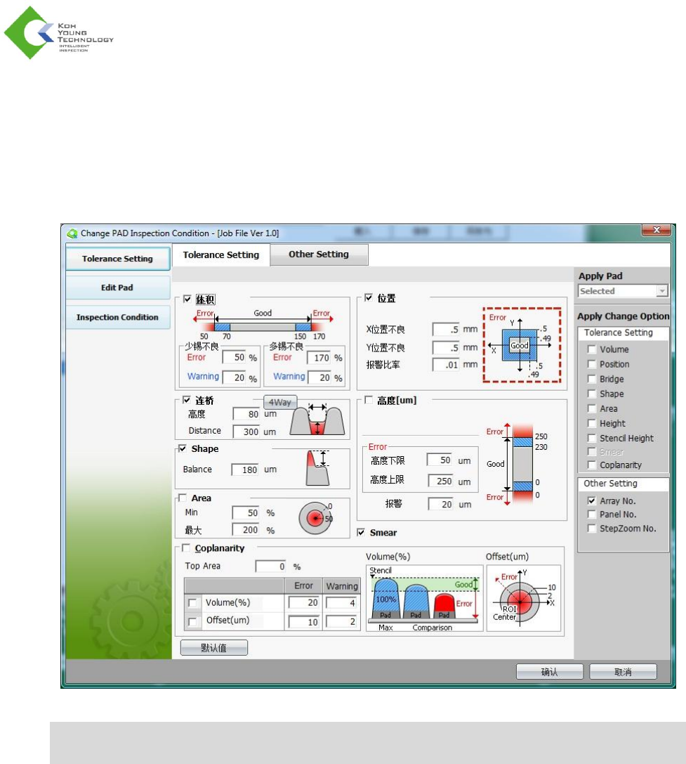 选择 Tolerance Setting(公差设置)菜单将显示 Change PAD Inspection Condition (更改焊盘检测