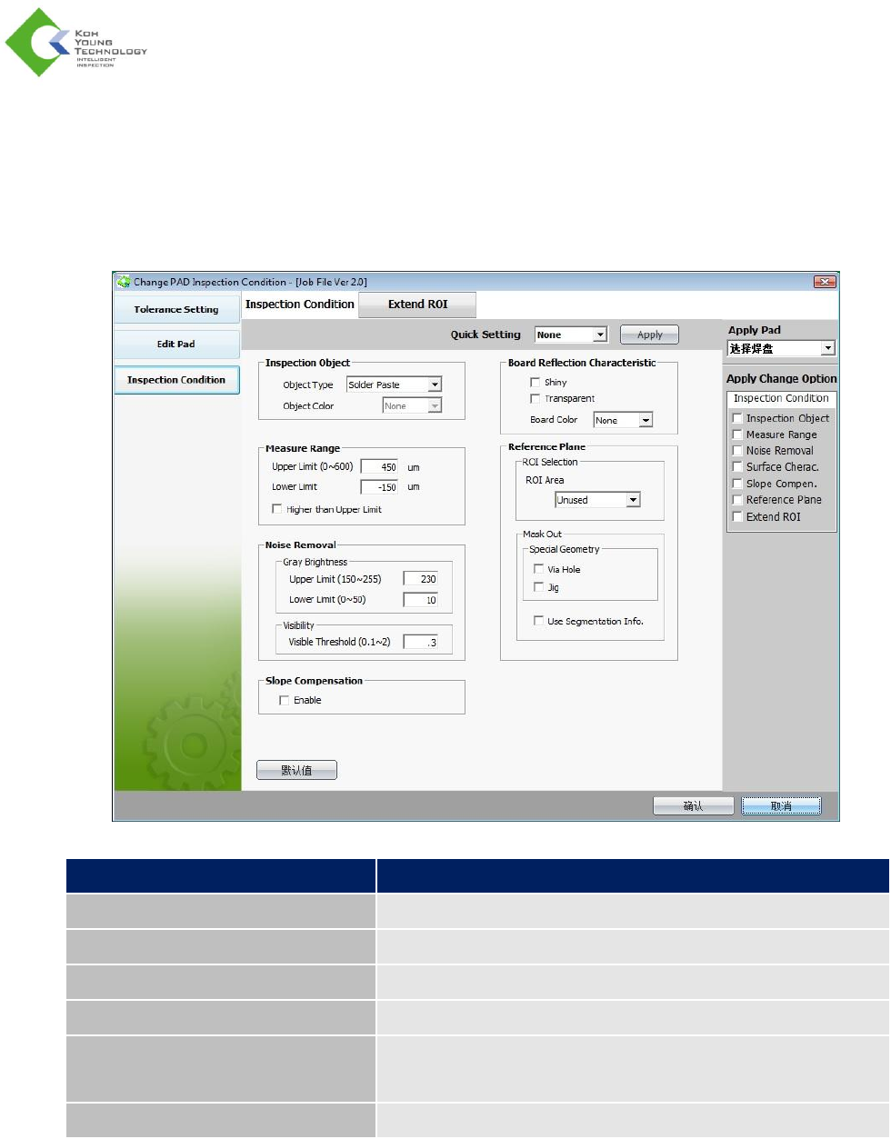 选择 Inspection Condition(检测条件)菜单将显示 Change PAD Inspection Condition(更改焊盘检