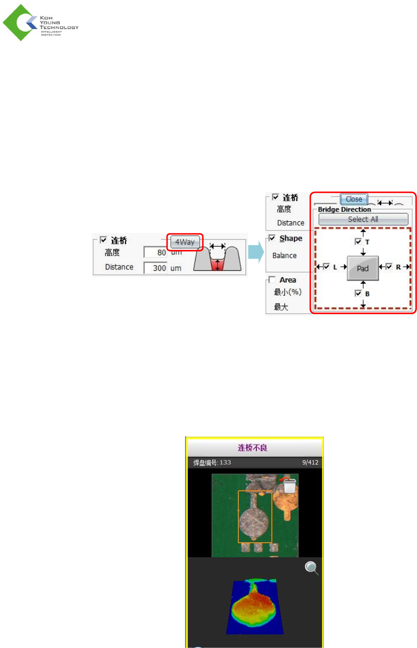 使用 4 向连桥检测选项时,即使在可能发生连桥的四向中未选定的方向上检测到连桥不良,也不对之