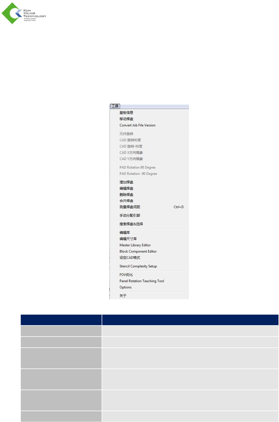 9 K oh Y oung Technolog y Inc. Measure to Optimi ze: A Comp lete 3D Inspection So luti on 标题 说明 “Load Pad file” ( 载入 Pad 文件) 载入 Pad 文件 (*.pad) 。 “ Load Job File ” ( 载入 Job 文件) 载入 Job 文件 (*.mdb) 。 “ Save Job File ” (保存 Jo…