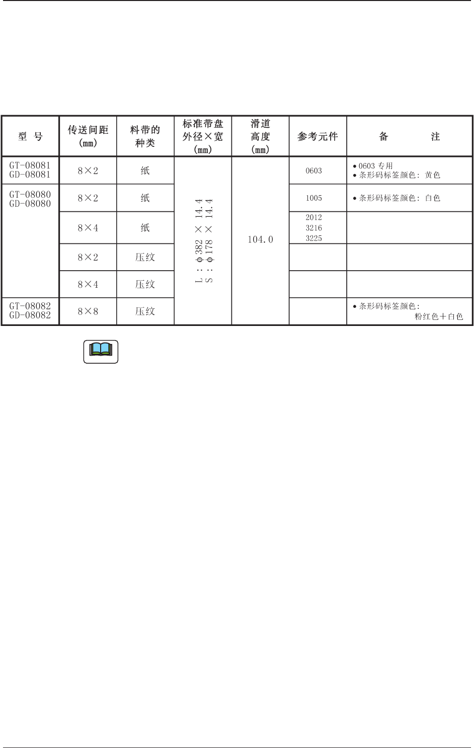 表中 “ 参考元件 ” 栏内列举的元件,根据不同厂家,元件的大小 也有所不同。请视为标准元件种类。 7. 7. 7. 7. 7. 带式送料器规格 带式送料器规格 带式送料器规格 带式送料器规格 带式送料器规格 7. 1 7. 1 7. 1 7. 1 7. 1 8mm 8mm 8mm 8mm 8mm 宽双带送料器规格 宽双带送料器规格 宽双带送料器规格 宽双带送料器规格 宽双带送料器规格 0601-004 7-1 7. 7. 7. 7. …