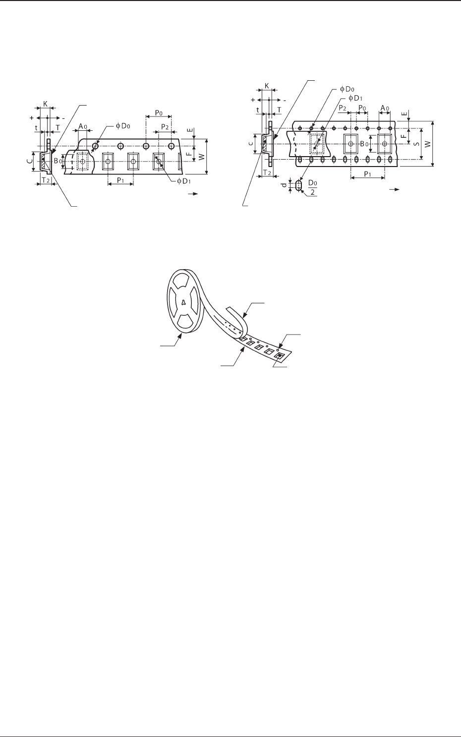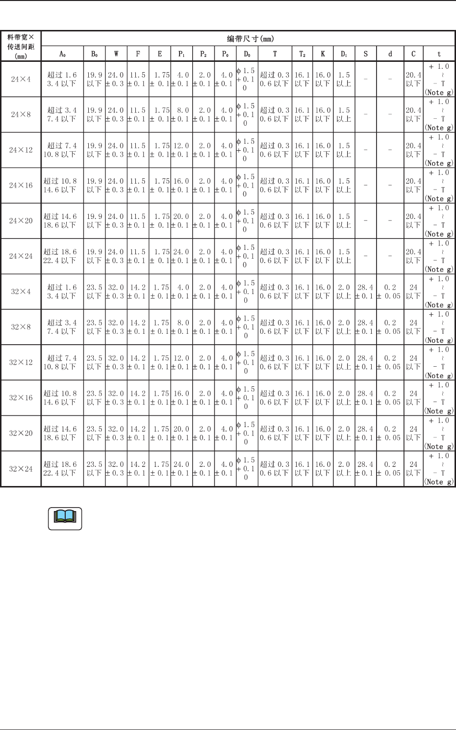 (a) A 0 × B 0 表示编带的方孔尺寸。 方孔和元件的间隙影响吸取率,因此请使用设定了适当间隙的编带 元件。 (b) 带式送料器规格并不能保证吸取率。吸取率根据主机的调整情况或主 机和带式送料器的搭配状况而有所变动。 (c) 压纹孔 (D 1 ) 在必要时设定。 (d) P 0 累计间距的允许差为 1 0 间距 ± 0.2mm 。 (e) 封口盖带不能卡在链轮齿孔或从装料带露出。另外, 封口盖带的厚度 在 0.07mm 以下 (…