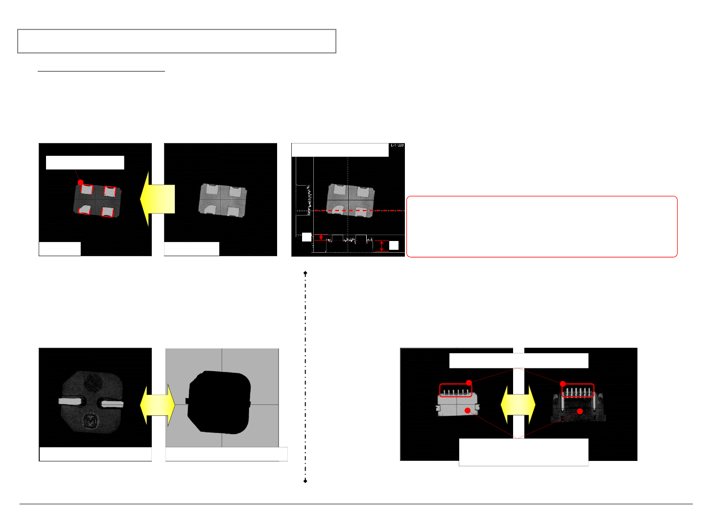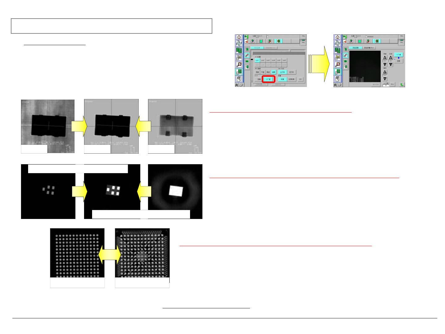 Page 7 ◆ 更改照明值时的图像标准状态 本页将以具有代表性的元件为例对更 改照明值时的图像标准状态进行 介绍说明。 Ex 1) 内部电极元件 1 ・・・ 钽, ECSP ,过滤器, LCC 元件下面有电极的元件,使用电极部 进行定位时, 请把光量设定到能充分获取电极部 ⇔ 元件主体部之间的亮度差的状态 。 标准光量 光量=强 登录电极部形状 光量=强时的亮度分布 ① 电极部 元件主体部的亮度差 : 100 或 100 以上 ②…