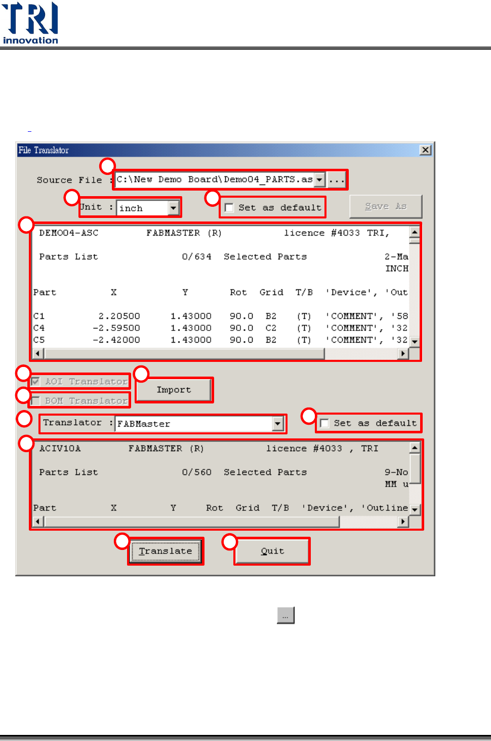 Test Research Inc. TR 7007 SII Us er Guide – Sof tware 99 5 A TPG 功能介紹 5.1 元件資料檔案 (CAD) 編輯與載入 5.1.1 開啟元件資料檔案 1 2 3 4 5 6 7 1) Translator – 將 CAD 檔案轉換成 AOI 檔的工具。 2) AOI File – 輸入所欲開啟的 AOI 檔案的路徑,或按下 按鈕瀏覽。 3) BOM File – 目前此…
