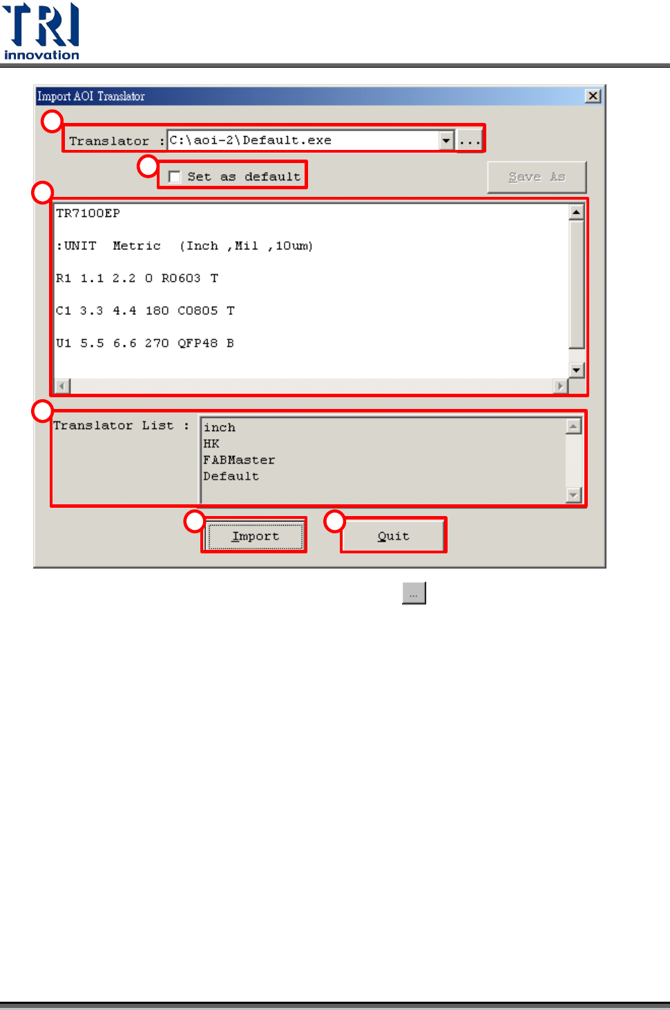 Test Research Inc. TR 7007 SII Us er Guide – Sof tware 101 5) AOI Translator – 本功能目前不開放。 6) BOM Translator – 本功能目前不開放。 7) Import – 匯入轉檔工具程式,若 [8 Translator] 下拉選單中沒有所需的轉檔工具, 可使用此功能來匯入。 8) Translator – 經由此下拉式選單選擇所需的轉檔工具。 9…