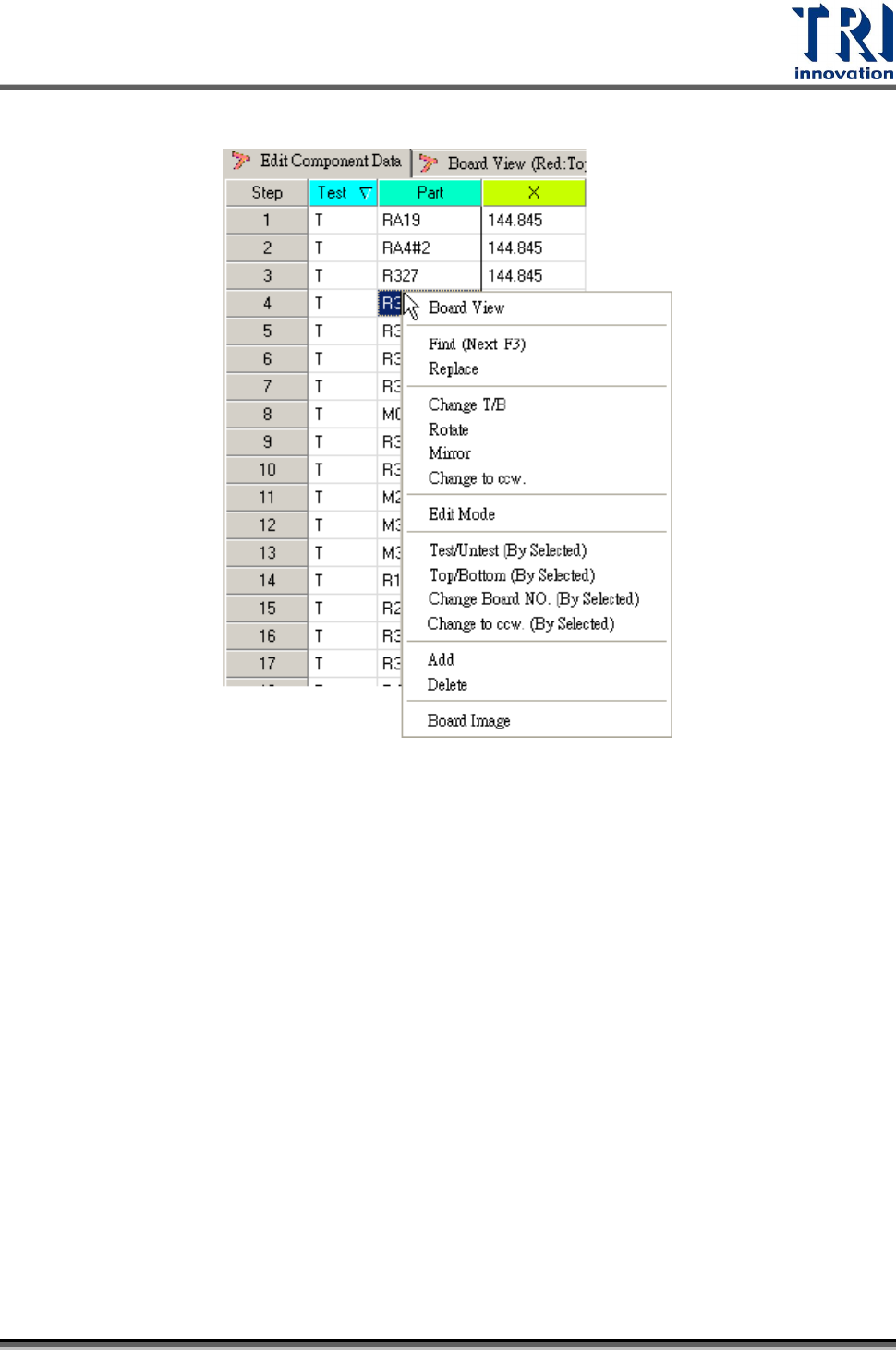 Test Research Inc. 104 TR 7007 SII User Guid e – Softwar e 5.2.1 B OARD V IEW 將所匯入檔案中所有元件的位置以圖形表示出來。 紅色標示表示位於正面的元件,綠色標示表示位於背面的元件。 在繪圖區域按一下滑鼠右鍵,會出現以下工具列。可以選擇只檢視正面或反面,或按 下 [Zoom In] 、 [Zoom Out] 來圖形放大或縮小, [Zoom to Extents]…