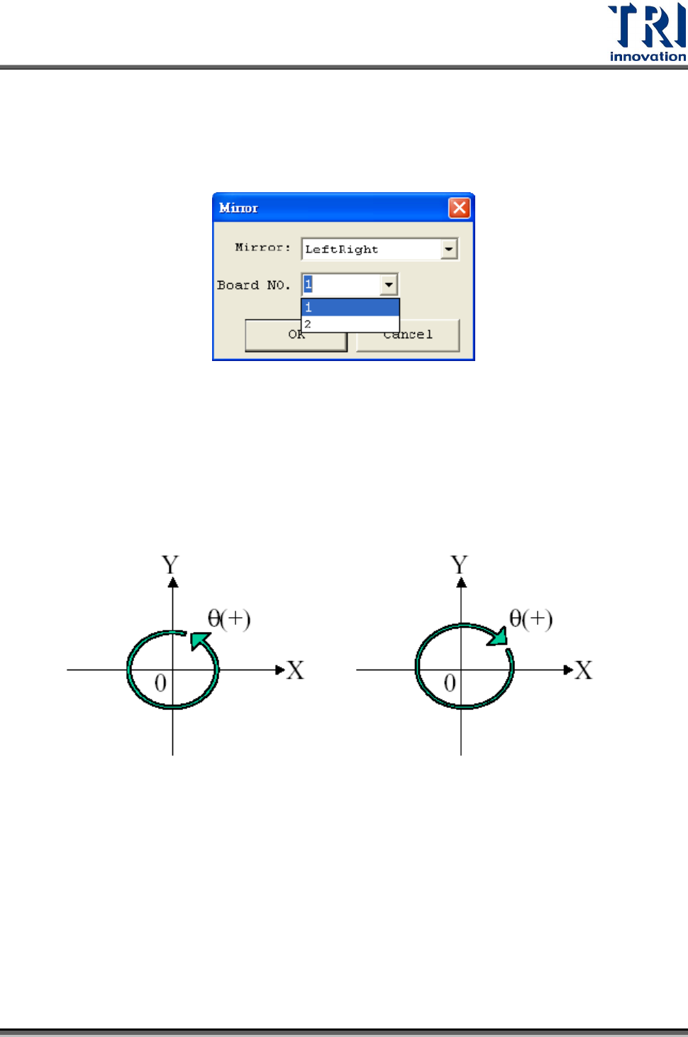 Test Research Inc. TR 7007 SII Us er Guide – Sof tware 107 上下鏡射 (TopBottom) – 以板子的正中央之橫軸為準,將位於中央橫軸上方的元件投射 到下方,位於下方的元件投射到上方,進行此動作元件之 X 軸方向座標並不會改變。 選擇鏡射方向視窗,並選擇要鏡射的板號後,按下 [ 確定 ] 系統即開始進行鏡射動作。 5.2.7 C HANGE TO CCW . 系統中認定元件角…