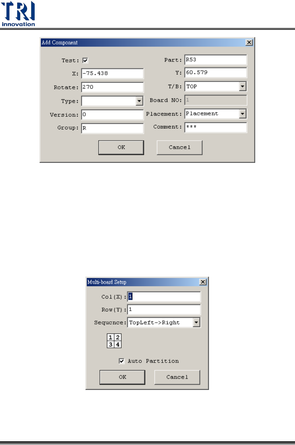 Test Research Inc. TR 7007 SII Us er Guide – Sof tware 111 按下 [ 取得進板角度 ] ,會出現 [ 取得進板角度 ] 視窗,在此可以重新進行計算進板角度的 五個步驟。 5.3.2 G ENERATE 此步驟中,在工具列之 [ Generate ] 可以設定 [ Generate MB Data ] 。在每一連板的定位 元件都已設定完成後,可以按下本按鈕,系統即可自動產生多連板元…