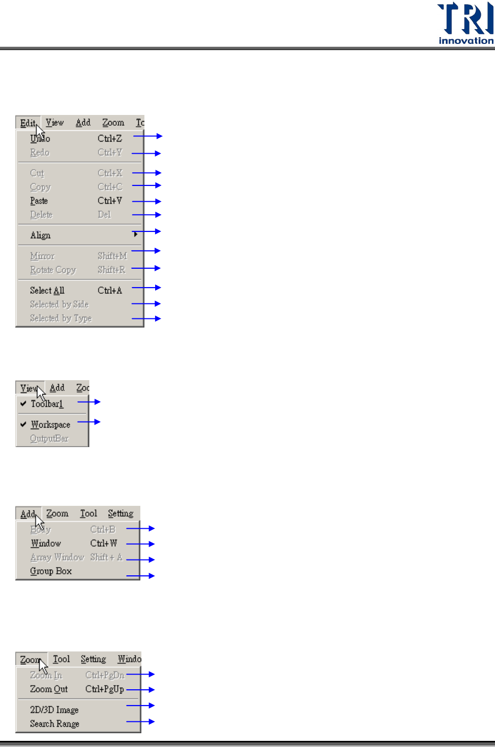 Test Research Inc. TR 7007 SII Us er Guide – Sof tware 127 5.6.2 E DIT 返回前一動作 重做上一動作 將所選擇的框剪下 複製所選擇的框 貼上複製或選擇的框 刪除所選擇的框 將所選擇的數個框朝指 定方向對齊 鏡射所選擇的框 將所選擇的框依指定方 向複製且旋 轉 選擇全部的框 將與已經點選的框位於 同側的框選 擇起來 將與已經點選的框屬於 同 Type 的框選擇起來 5.6…