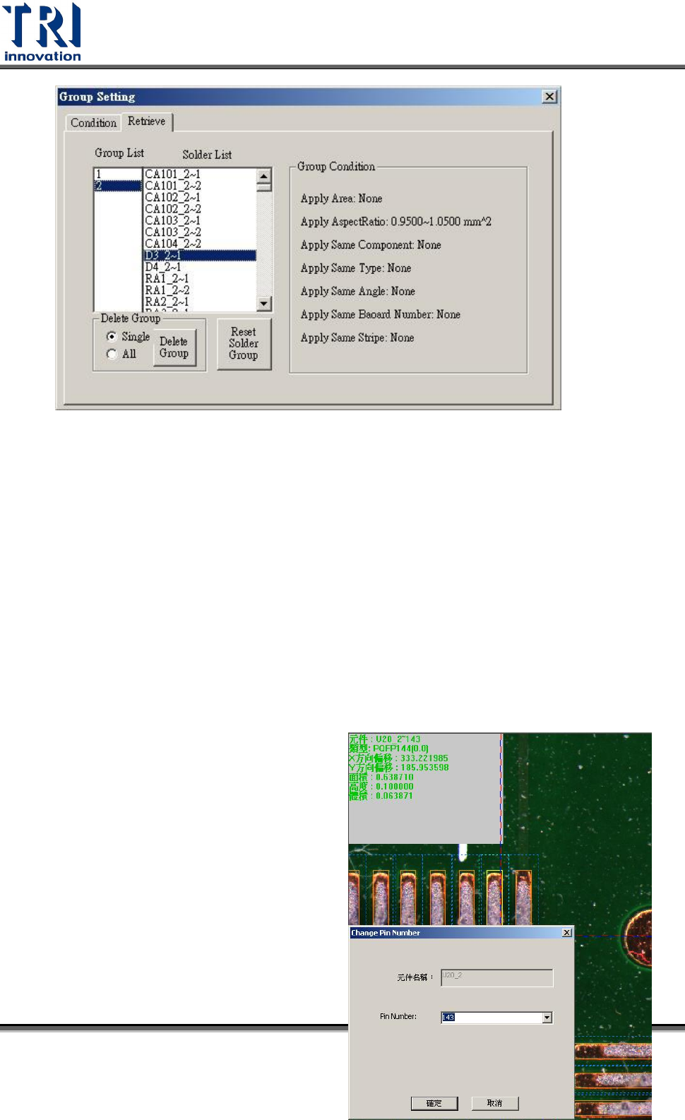 Test Research Inc. 162 TR 7007 SII User Guid e – Softwar e Re trieve : 你可以在 [ Retrieve ] 頁籤下刪除設好的群組或在某一群組中將某檢測框刪除。 . [ Group List ] :群組列表。 [ Solder List ] :在 [ Group List ] 點選群組後,列出群組中的所有檢測框。 [ Group Condition ] :此一群組的篩選…