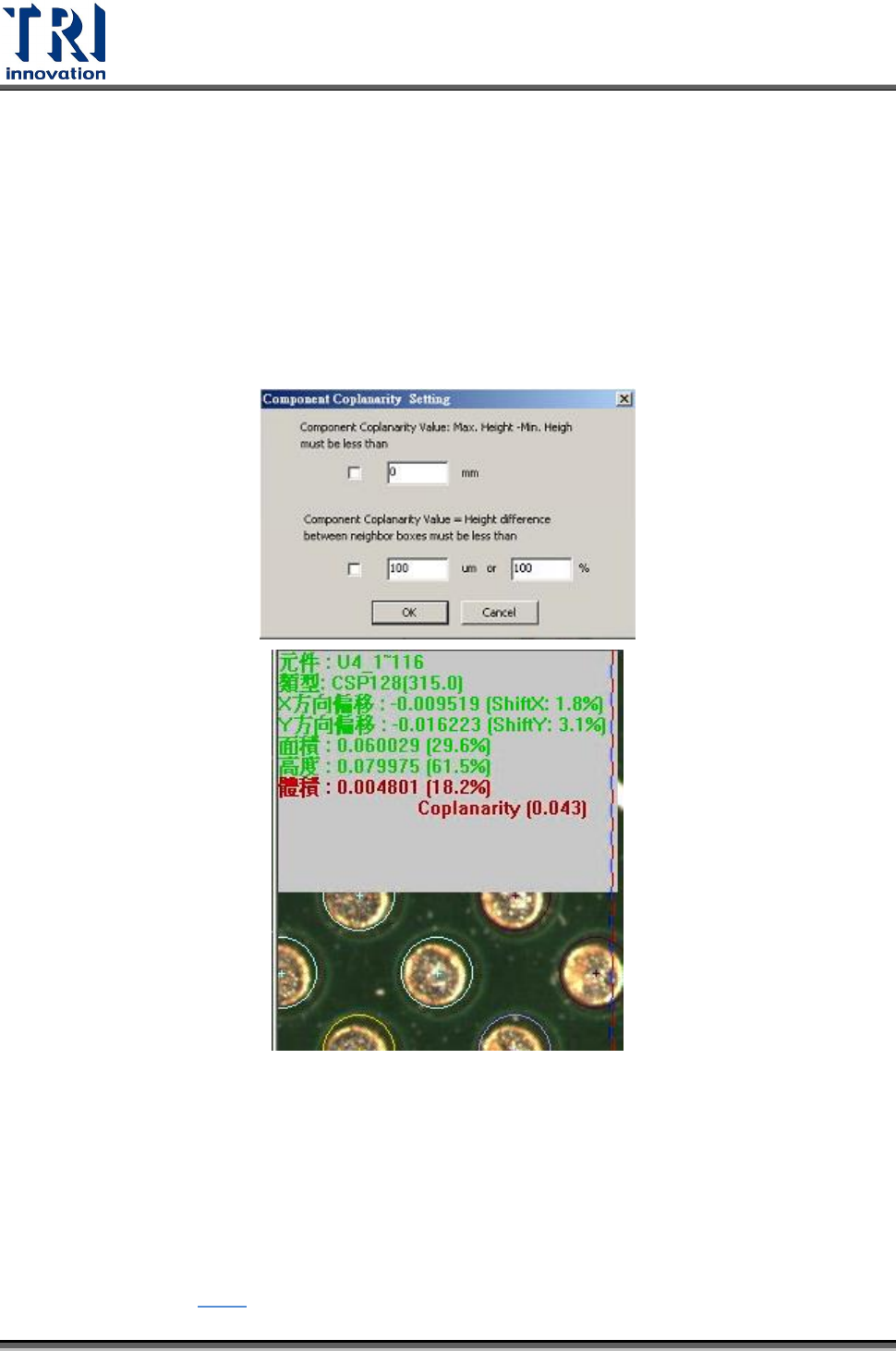 >所設定的 Coplanarity 值則為瑕疵。顯示結果如圖所示。