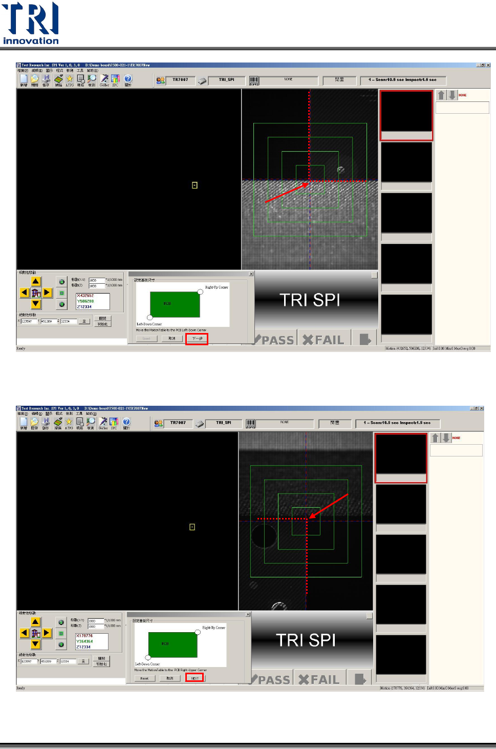 Test Research Inc. 8 TR 7007 SII User Guid e – Softwar e 4) 將攝影機移到待測板之右上角位置後按下 [ 下一步 ] 按鈕。