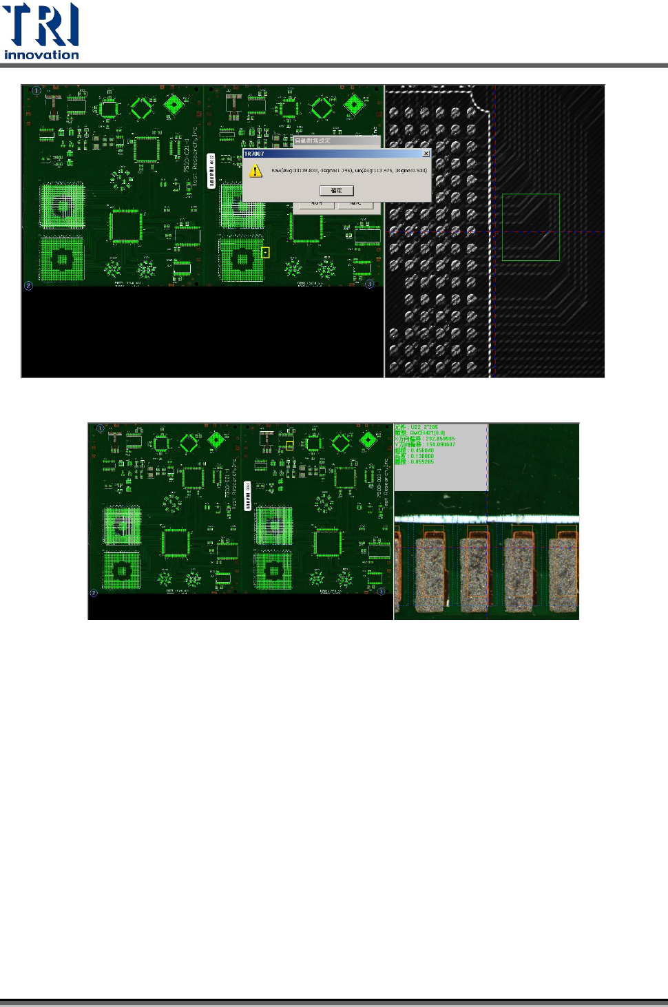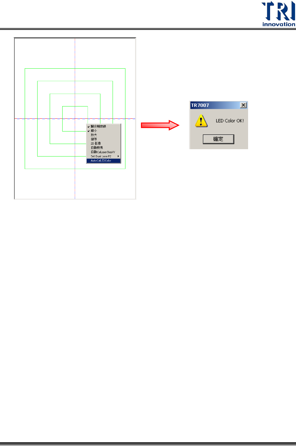 Test Research Inc. 17 0 TR 7007 SII User Guid e – Softwar e 完成後點選確定,重新掃圖檢視畫面是否清楚。 自動 CalLaserBiasXY Set Dual Lane P2 AutoCalLEDColor- 自動校正 LED 彩色顯示,透過此功能能讓 彩圖更清 楚。 使用方式:拿出一張白紙放在鏡頭下,接著便點選 [ AutoCalLEDColor ] , 完成後會跳…