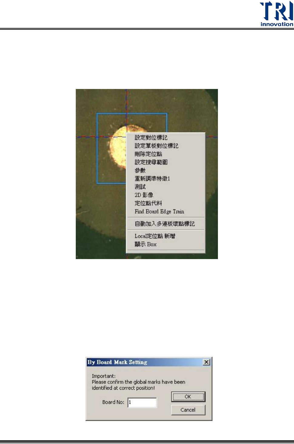 Test Research Inc. 174 TR 7007 SII User Guid e – Softwar e Step.3 [ 單板對位標記 ] 框在 FO V 中出現,調整其搜尋範圍及位置至適當 大小後點選 [ 確定 ] 如下圖。 Step.4 訊息視窗會跳出並詢問你是否編輯單板對位點,選擇 [ 是 (Y) ] 。詳 細編輯內容請參閱 5.5.2 。 Step.5 可看到單板對位點顯示如下圖,此例中,在 [ 單板對位標記 ] …