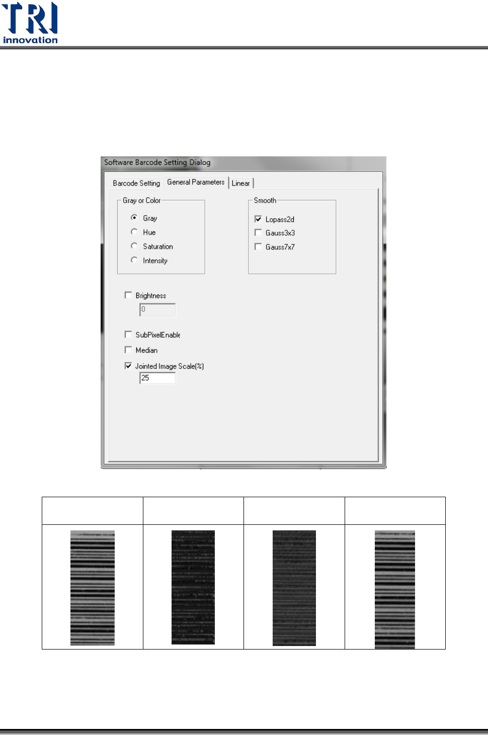 Test Research Inc. TR 7007 SII Us er Guide – Sof tware 209 Lopass2d 影像低通濾波,用來消除影像上高頻變化的部分,可使影像的 變化較均勻。 Gauss3x3 高斯模糊,使用的是 3x3 的遮罩。 Gauss7x7 高斯模糊,使用的是 7x7 的遮罩。 Brightness :增強加影像的明亮度。 SubPixelEnable :提升次像素 (subpixel) 解碼能力。…