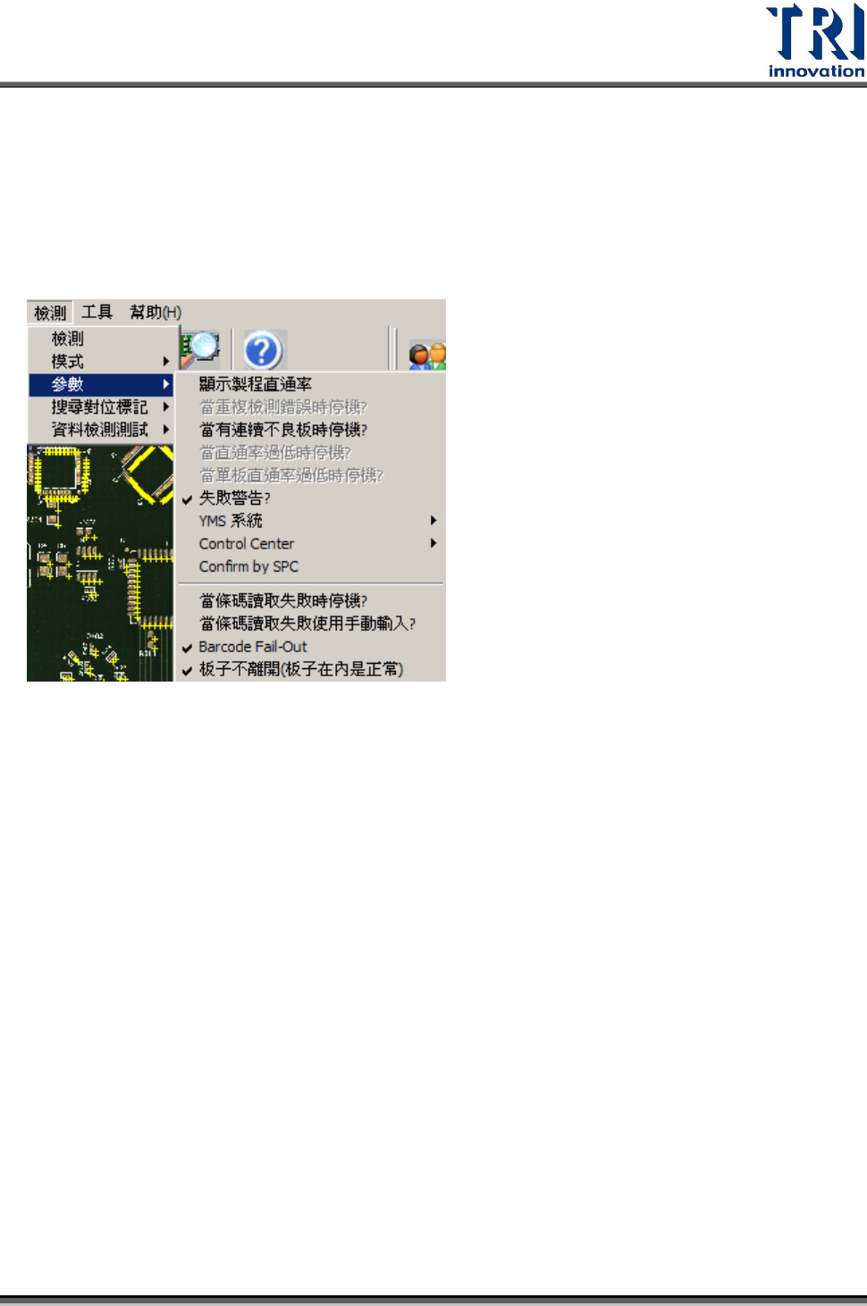 Test Research Inc. 210 TR 7007 SII User Guid e – Softwar e 7.5 檢測 開始檢測 設定檢測模式 設定檢測參數 在影像中重新搜尋定位 點 使用 2D 攝影機量測 PAD 大小 7.5.1 檢測 開始檢測。 7.5.2 模式 連續檢測且遇到不良不 停 遇不良時則會停下來待 使用者確認 全部勾選 全部取消