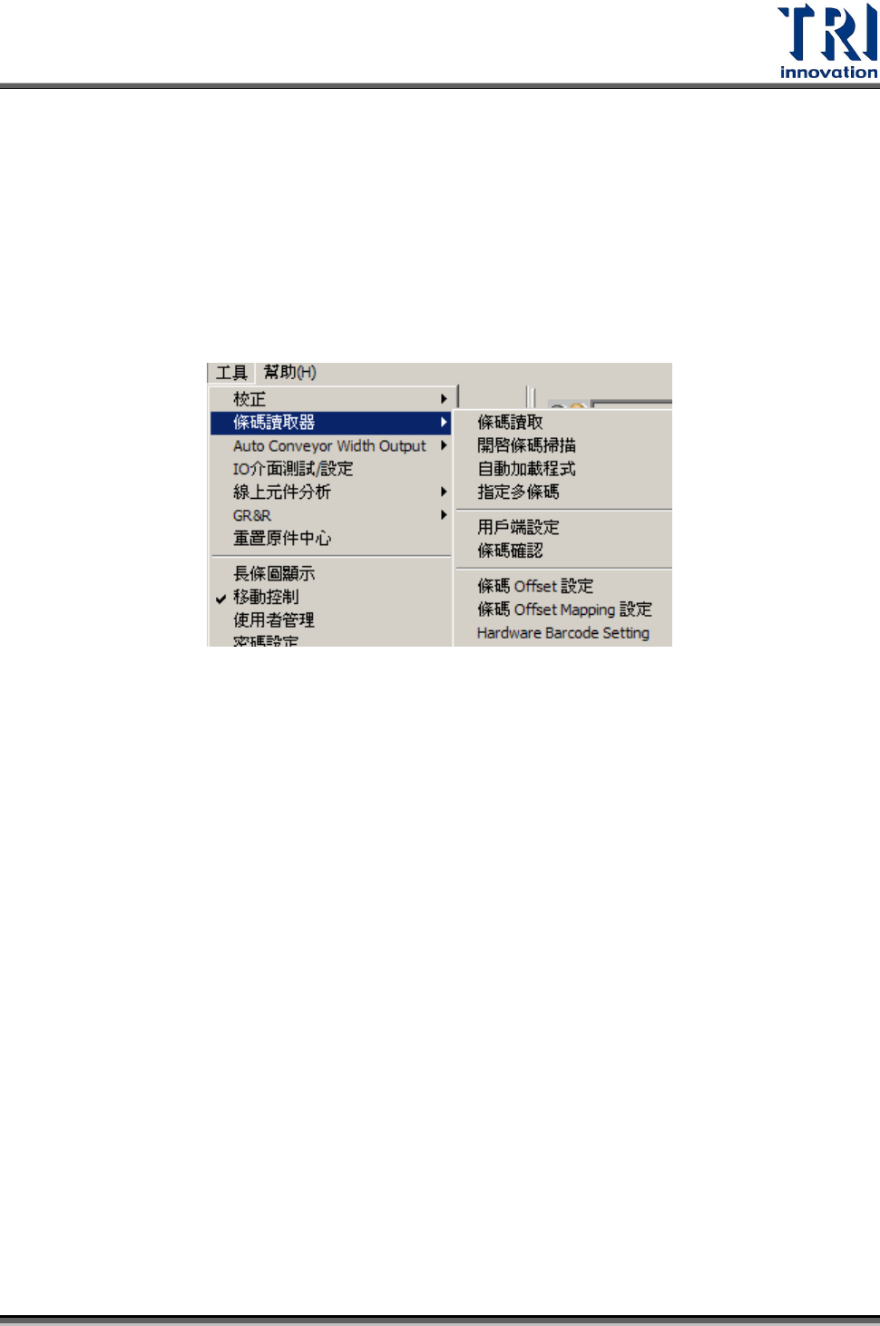 Test Research Inc. 214 TR 7007 SII User Guid e – Softwar e 7.6 工具 校正 設定 Barcode 選項 自動板寬控制 硬體輸入輸出點測試 線上元件資料分析 GR&R 測試輔助工具 對於所有元件重設元件的中心位置 顯示檢測框內灰階分佈之直方圖 顯示 Table 動作控制面板 使用者權限密碼管理 修改目前登錄使用者的密碼 選擇介面語言 系統其他設定選項 定義各權限使用者所…