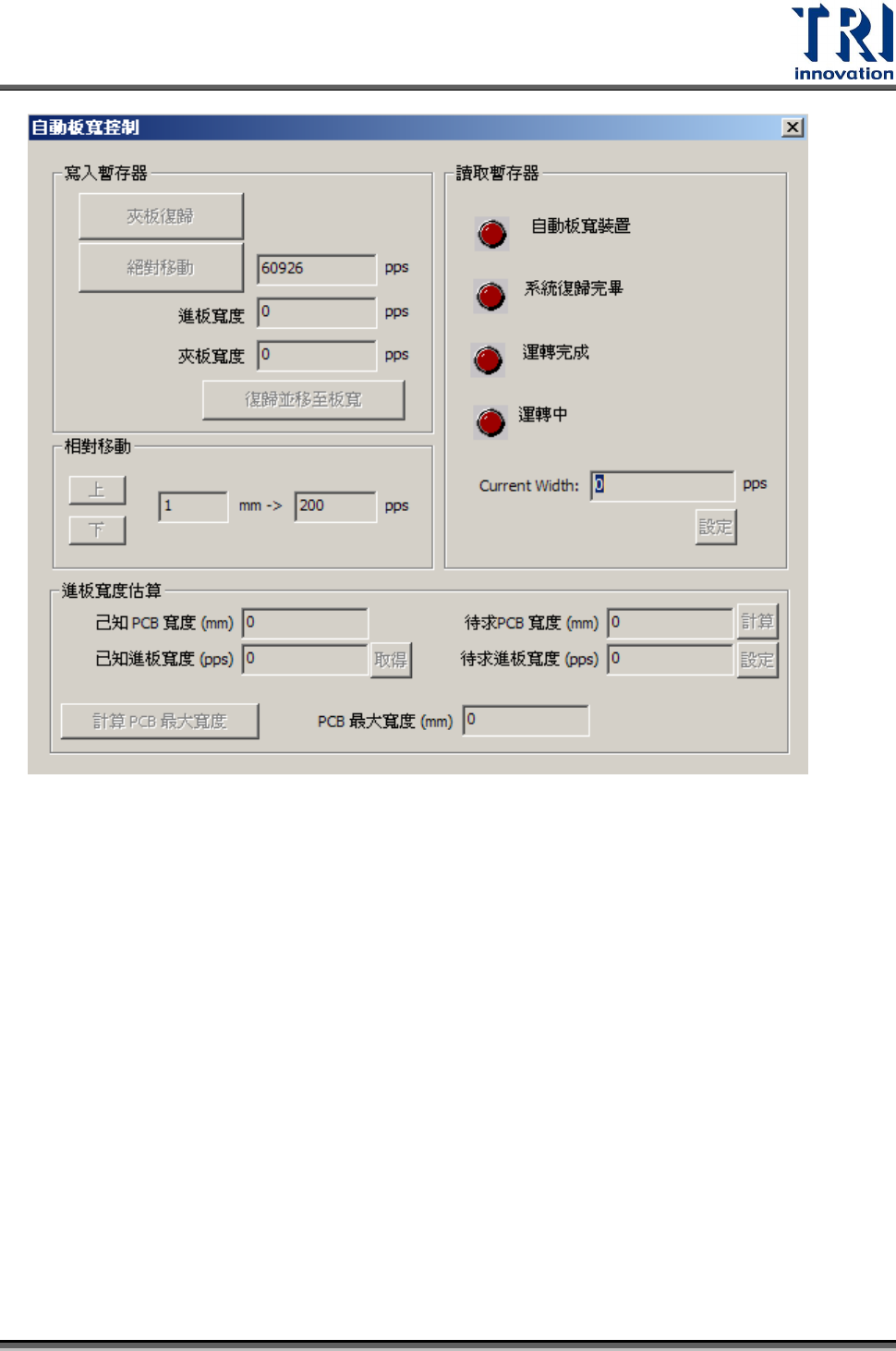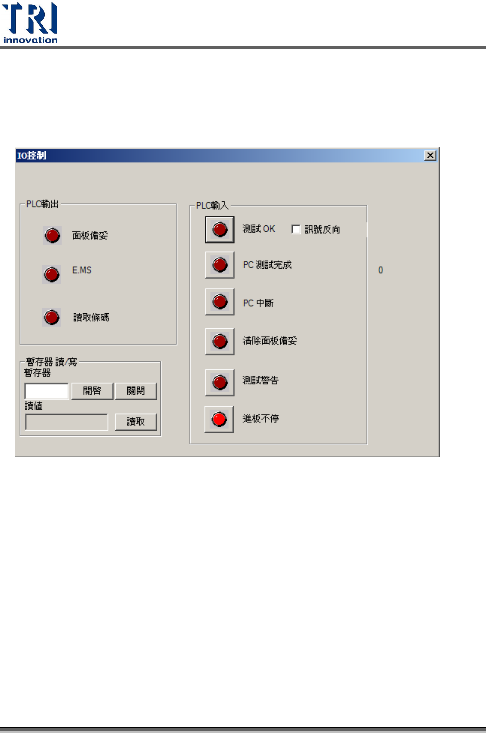 Test Research Inc. 222 TR 7007 SII User Guid e – Softwar e 7.6.4 IO 介面測試 / 設定 選取後,會出現以下對話框可供 IO 測試與 PLC 連線測試。