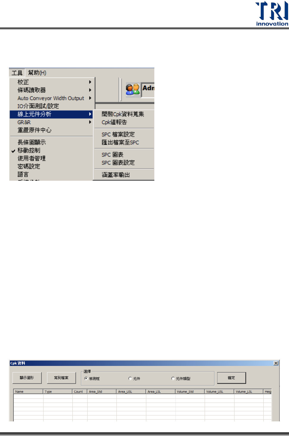 啟動 Cpk 資料收集功能。當啟動本功能時,系統即開始收集檢測結果的資料,計算每
