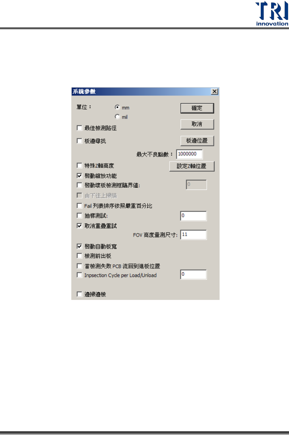 Test Research Inc. TR 7007 SII Us er Guide – Sof tware 241 7.6.13 系統參數 可在此設定系統其他參數 單位–可選擇要使用的單位 最佳檢測路徑–掃描路徑最佳化 板邊尋找–勾選表示在掃描前會先掃瞄板邊,可以自行按下 [ 板邊位置 ] 按鈕設定板邊位 置,按下 [ 板邊位置 ] 後指定電路板的最右端位置為板邊位置即可。