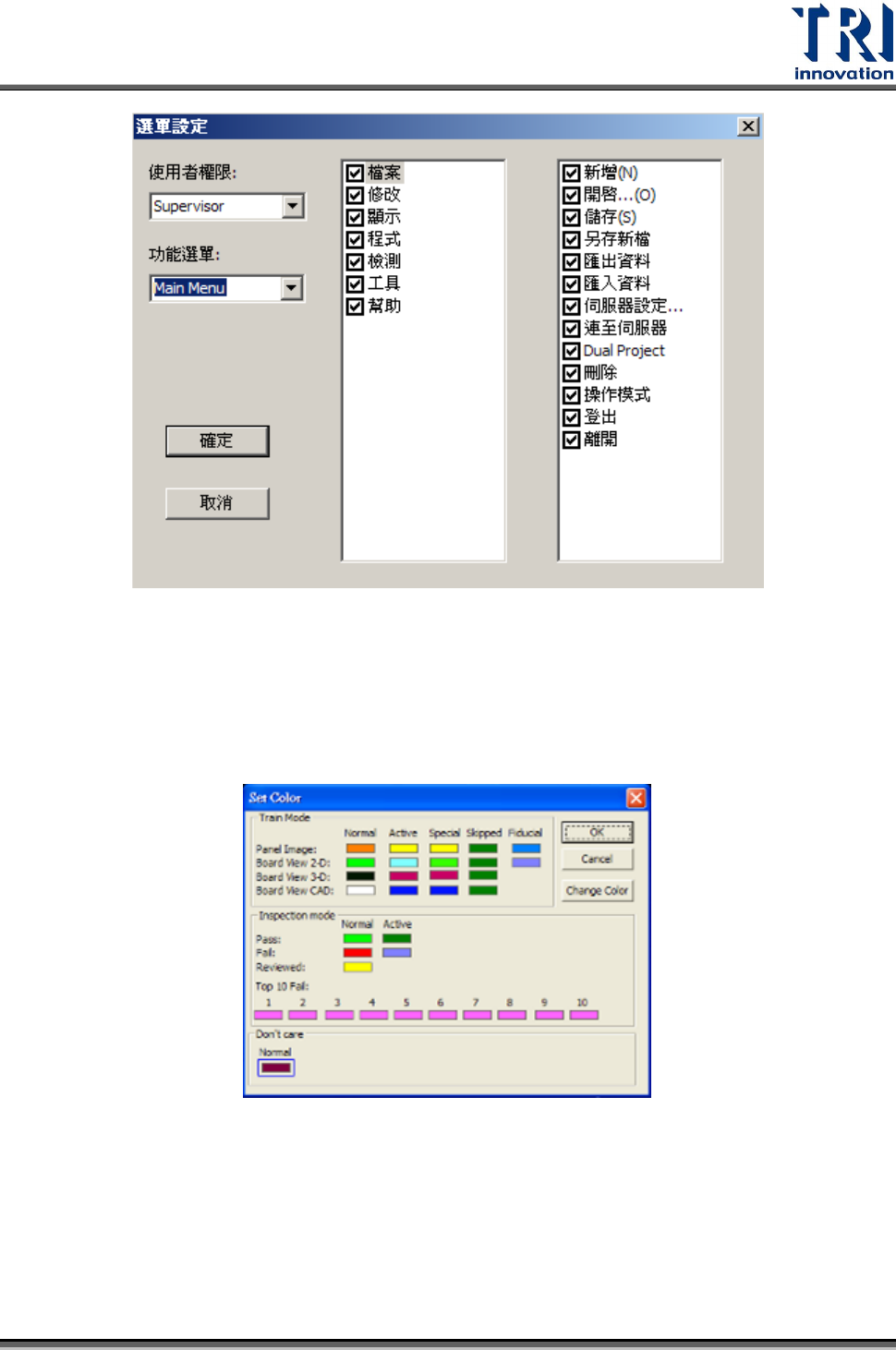 Test Research Inc. 244 TR 7007 SII User Guid e – Softwar e 啟動自動板寬–開啟自動板寬功能(需要有自動板寬硬體套件) 檢測前出板 當檢測失敗 PCB 流回到進板位置 - 勾選代表開啟此功能 Inspection Cycle per Load/Unload 邊掃邊檢 7.6.14 選單設定 可利用此功能編輯各權限的使用者可以使用的功能。